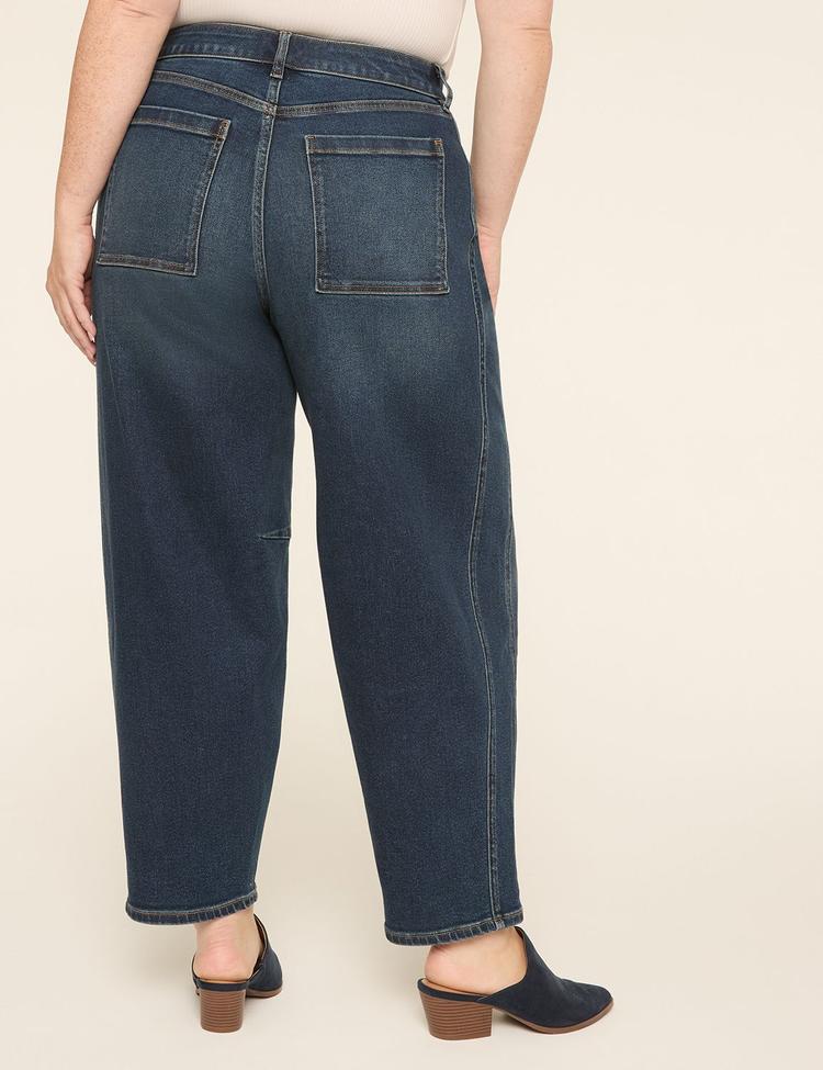 Experience the perfect blend of comfort and style with these Plus Size Barrel Patch Pocket Jeans in a rich dark denim blue. Designed with a mid-rise waist and Flex Magic stretch waistband, they offer a no-gap, all-day comfortable fit that moves with you. The relaxed barrel leg tapers gracefully towards the ankle, creating a flattering silhouette enhanced by strategically placed patch pockets and darts for a subtle lift. Crafted from premium stretch denim, these cropped-length jeans are versatile for casual outings or business casual settings. Elevate your wardrobe with denim designed specifically for curves, delivering both comfort and a modern classic look.