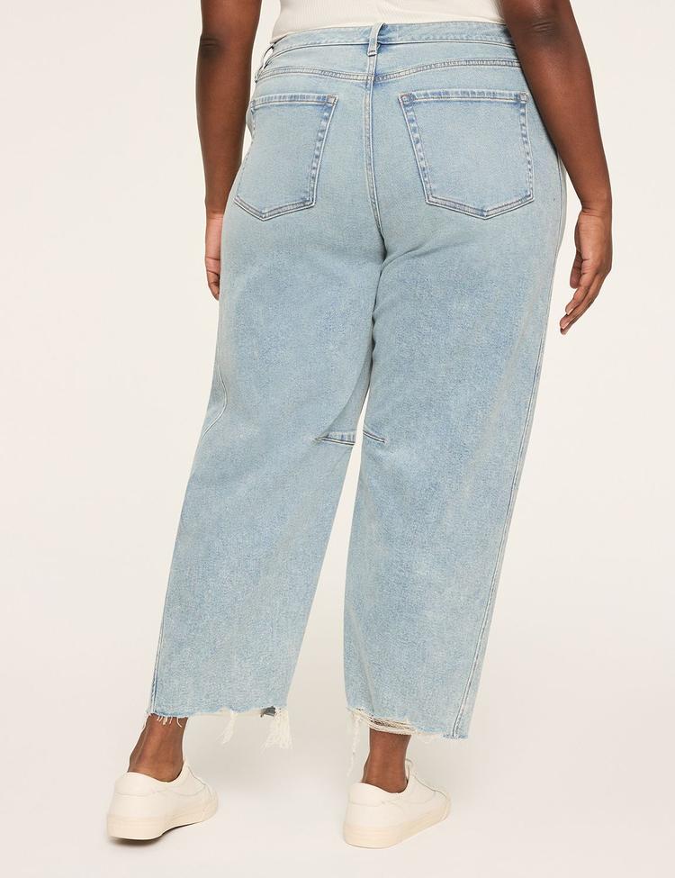 Discover the perfect blend of comfort and style with these Plus Size Barrel Raw Hem Jeans by Lane Bryant. Crafted from premium stretch denim, these jeans feature a relaxed fit that tapers elegantly towards the ankle, highlighting a flattering mid-rise waist with a no-gap Flex Magic waistband for all-day ease. The light blue denim is enhanced with raw edges at the hem and subtle two-tone side details, while darts along the legs ensure a sculpted silhouette. Equipped with functional pockets and belt loops, these versatile jeans transition seamlessly from casual outings to stylish everyday wear, making them a must-have staple for curves that demand both fit and fashion.