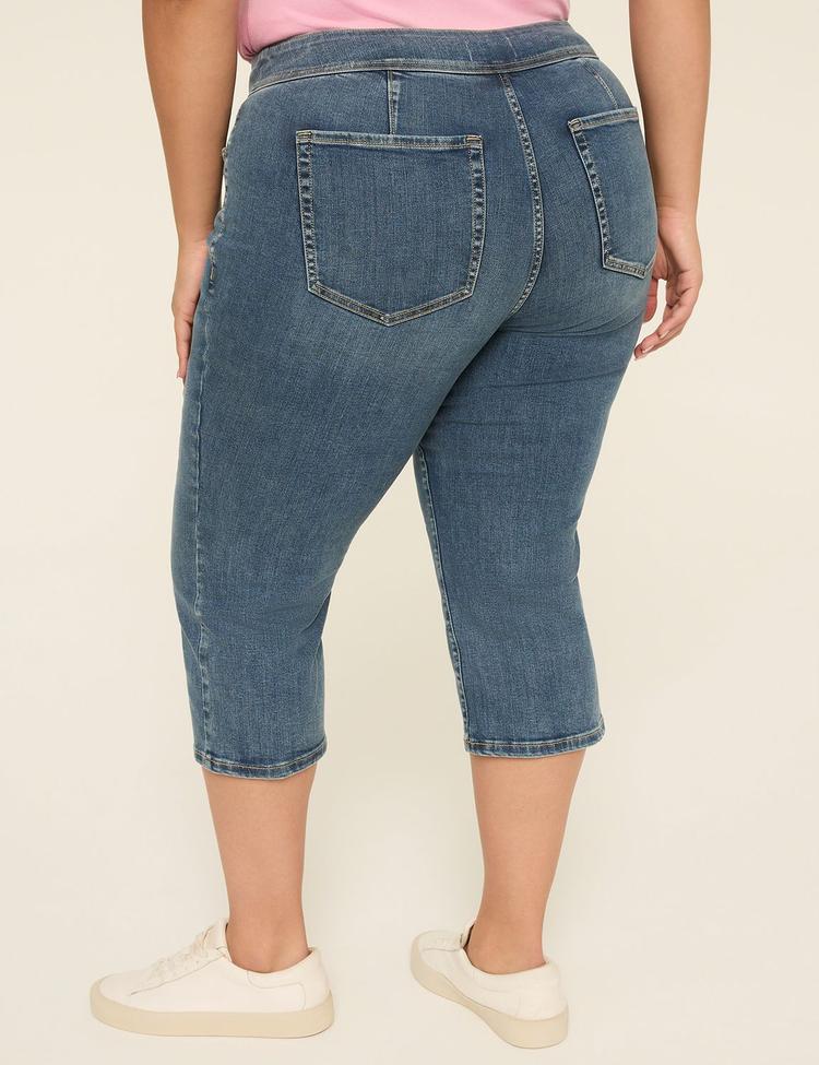 Embrace curve-flattering confidence with these Knockout High-Rise Pedal Jeans, designed especially for plus sizes. Crafted from a premium stretch denim blend of cotton, polyester, and spandex, these jeans deliver a sleek slim-fit silhouette that hugs your legs perfectly, ending at a trendy cropped length. The high-rise flat-front waistband offers tummy coverage and a no-gap, corset-like shape that moves with you for all-day comfort. Featuring classic five-pocket styling and a triple-button zip fly closure, these medium blue washed jeans combine the look and feel of traditional denim with the ease of leggings. Ideal for casual outings or workwear, they bring timeless style and superior fit to your wardrobe.