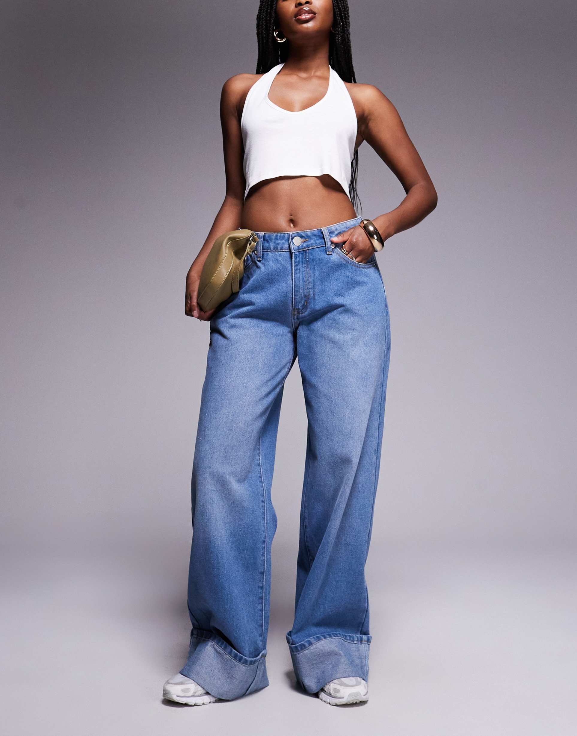 LIQUOR N POKER CINCH MIDRISE TURN UP BAGGY DENIM JEANS IN MIDWASH BLUE