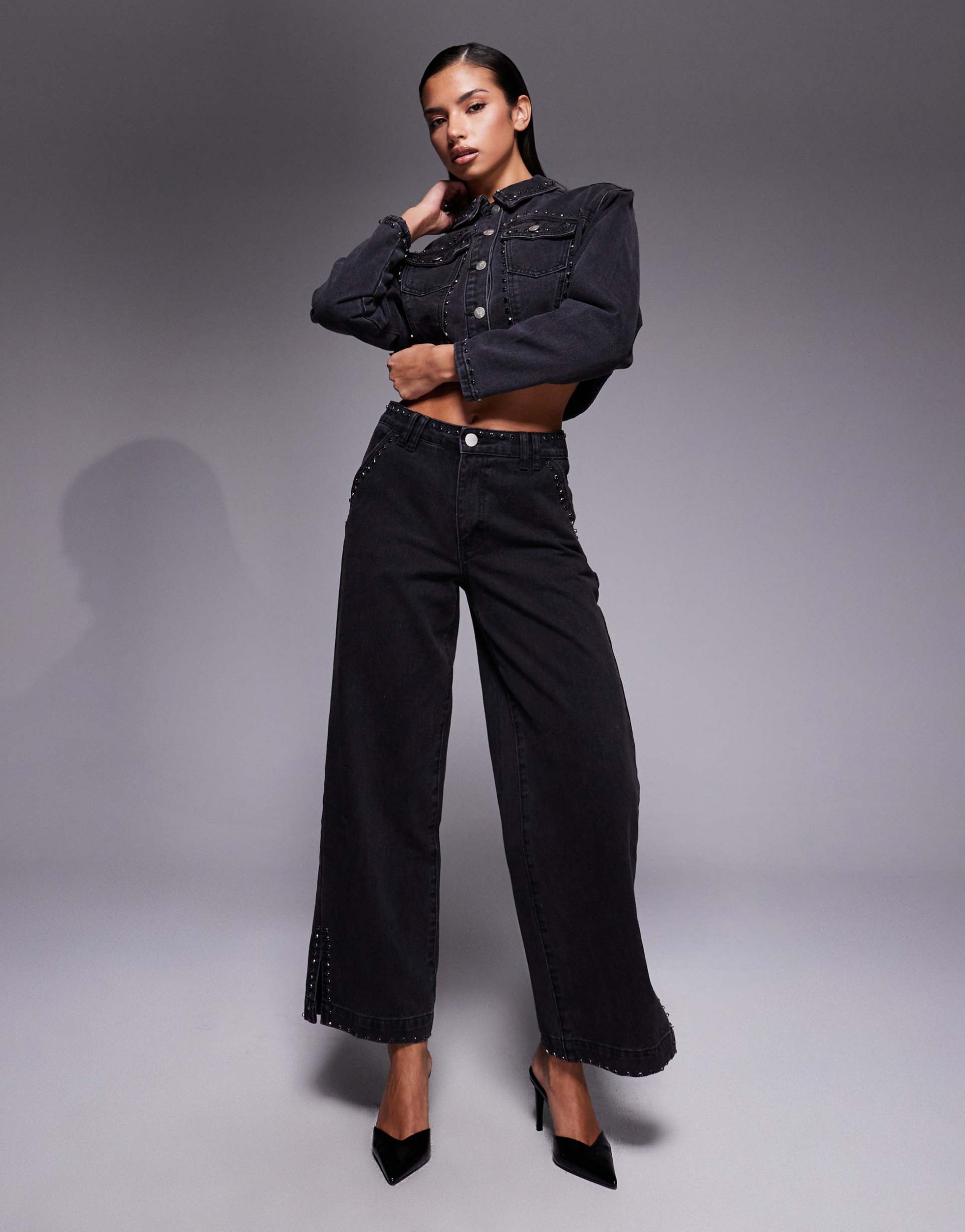 LIQUOR N POKER MID RISE STRAIGHT JEANS WITH DIAMANTE SEAM DETAIL IN WASHED BLACK - PART OF A SET