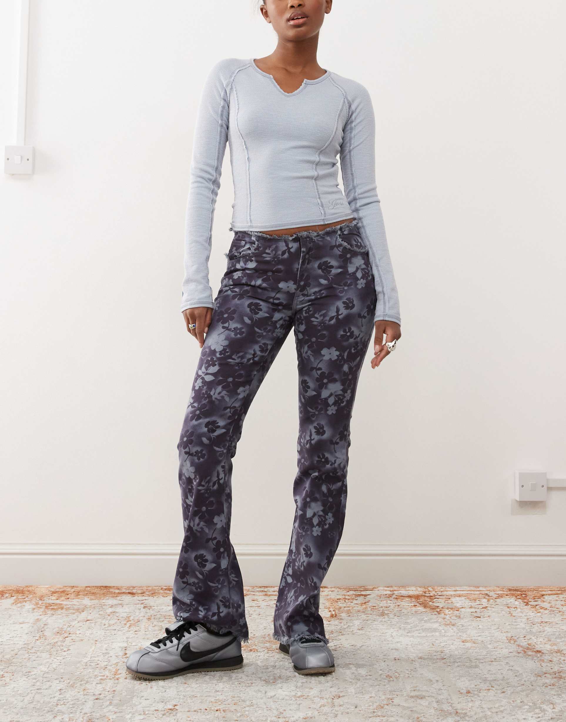 MONKI LOW RISE STRETCH BOOTCUT JEANS IN BLUE FLORAL