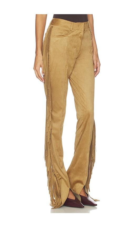 NORMA KAMALI FRINGE SPAT JEANS IN TAN.
