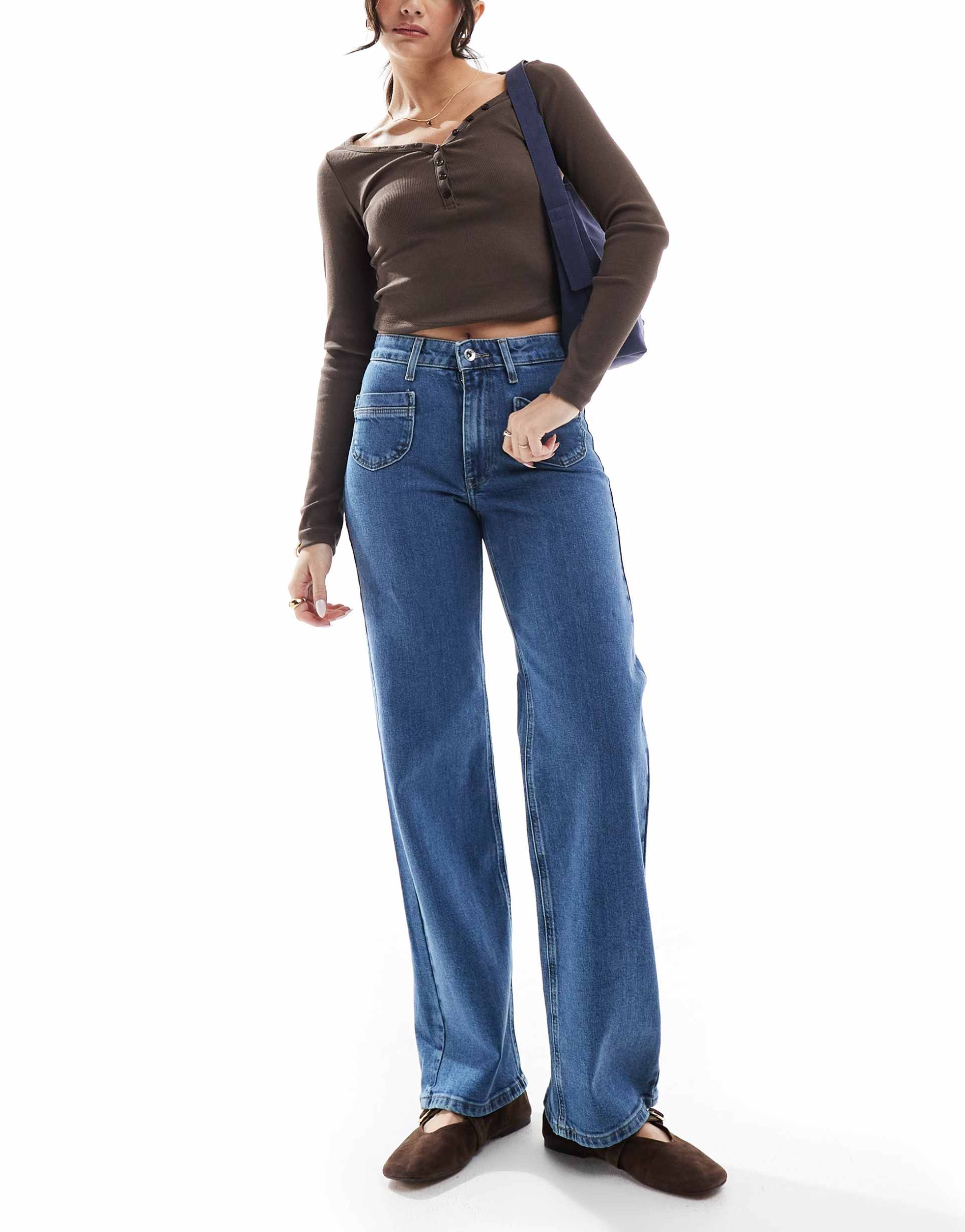 ONLY JUICY HIGH WAIST WIDE LEG JEANS WITH POCKET DETAIL IN MID WASH BLUE