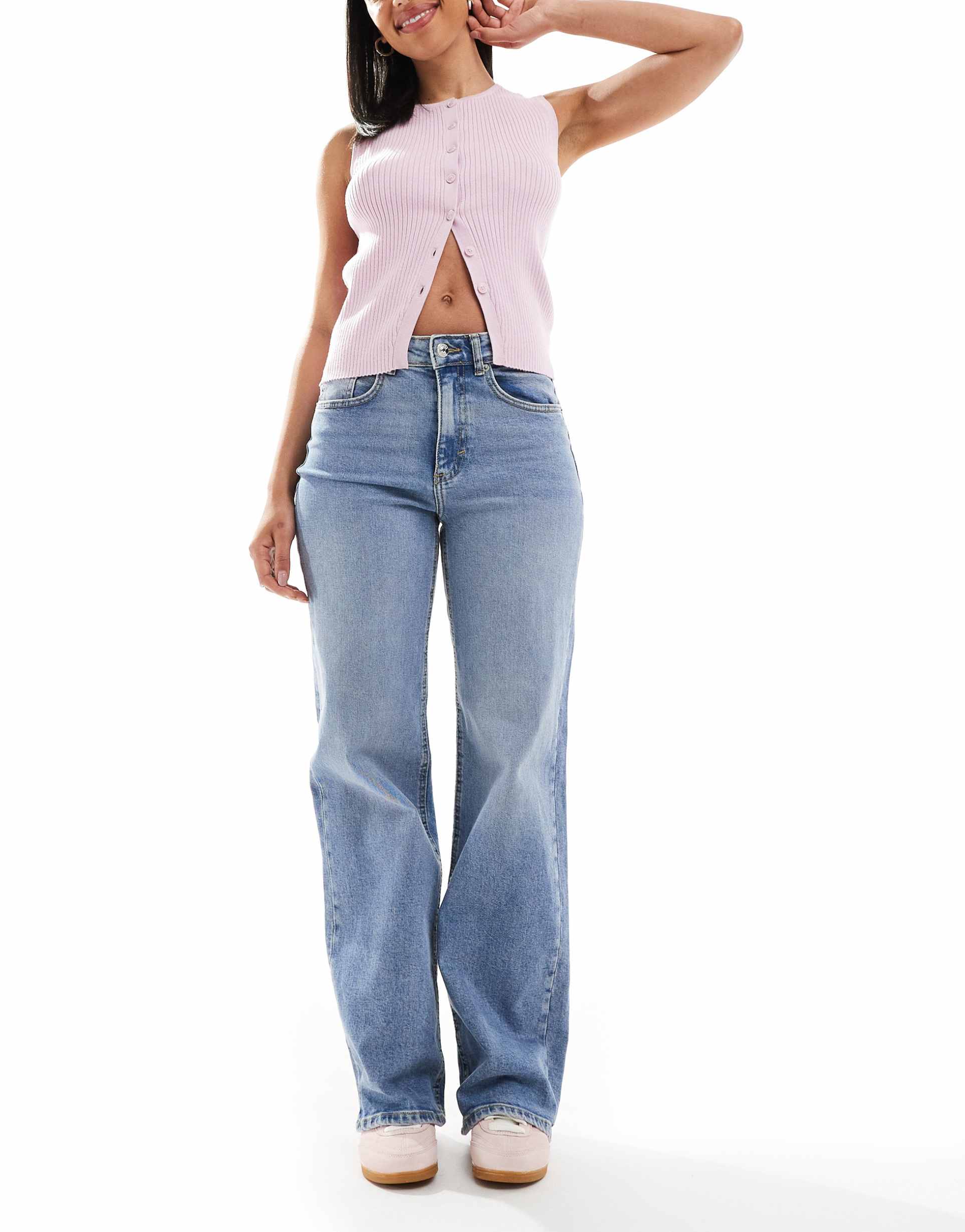 mid blue washed denim for casual chic look