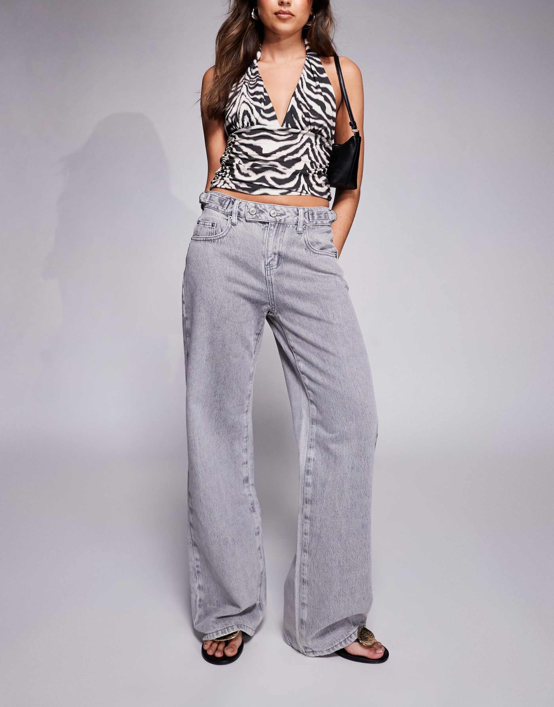 PRINCESS POLLY SCHEANA LOW RISE WAIST BUCKLE DETAIL WIDE LEG JEANS IN WASHED GRAY