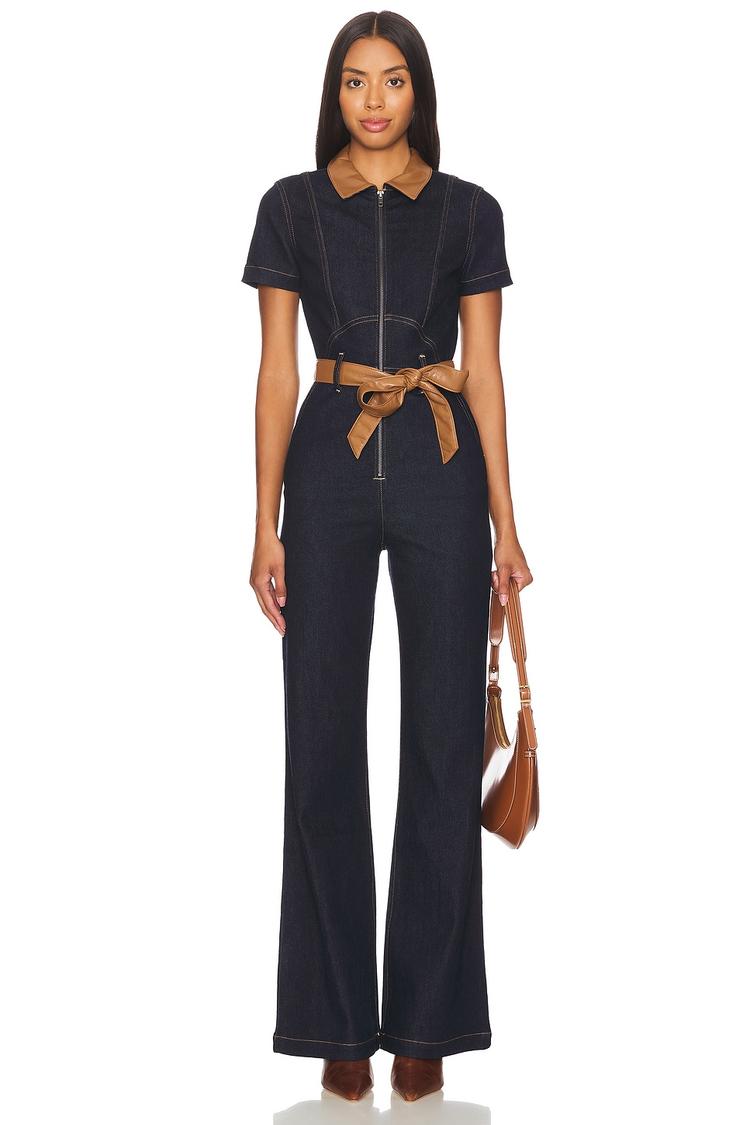 Structured in midweight denim with a matte dark blue finish, this overall dress features a flared maxi silhouette that flatters with comfort and style. The matte brown faux leather collar and attached waist tie add a chic contrast, while the front zipper closure ensures easy wear. Short regular sleeves and a clean hemline round out the modern, casual chic look. Ideal for casual outings, brunches, or streetwear, this versatile jumpsuit is a stylish choice for spring, autumn, and all-weather wardrobes.