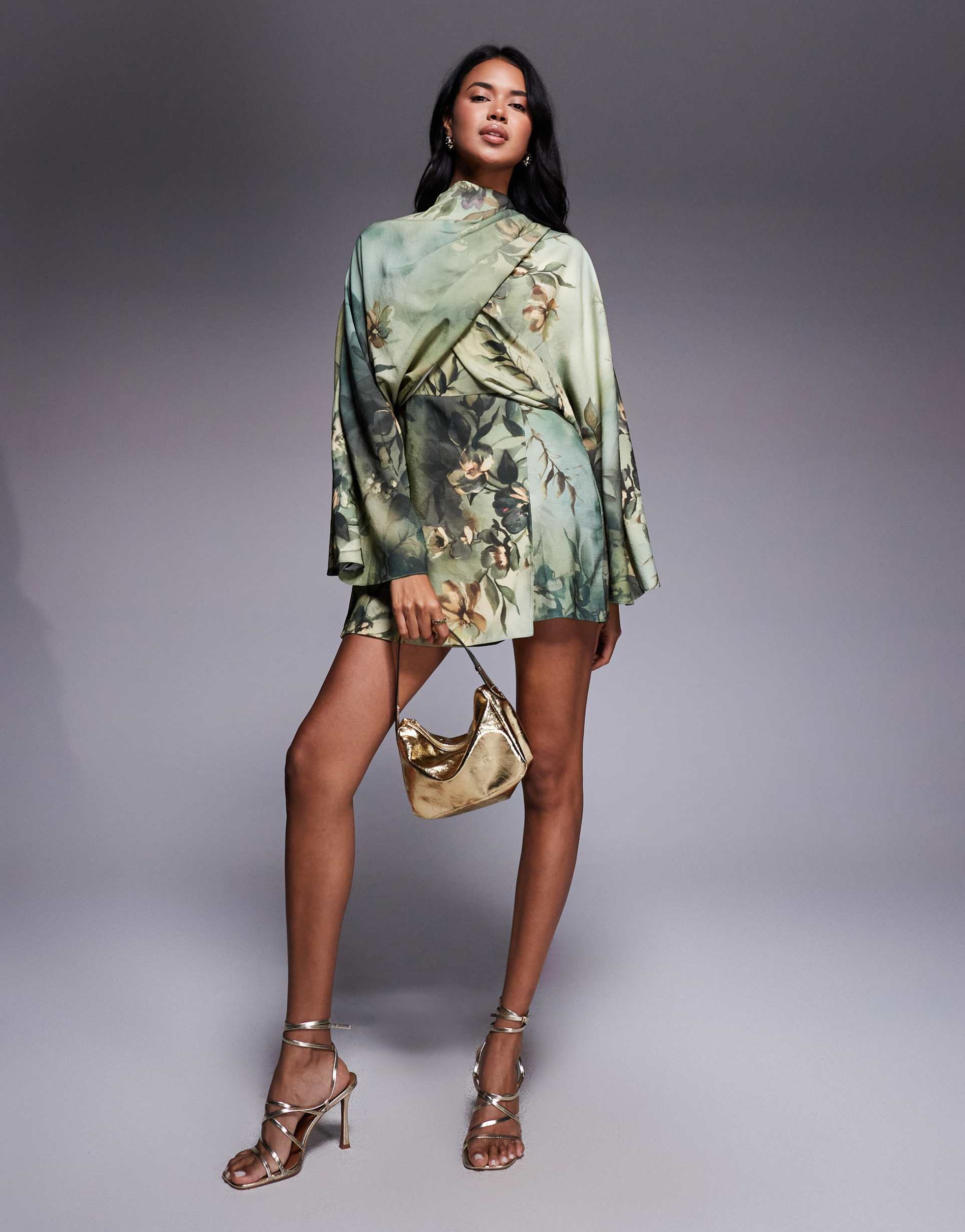 ASOS DESIGN BATWING WRAP HIGH NECK ROMPER IN GREEN FLORAL PRINT