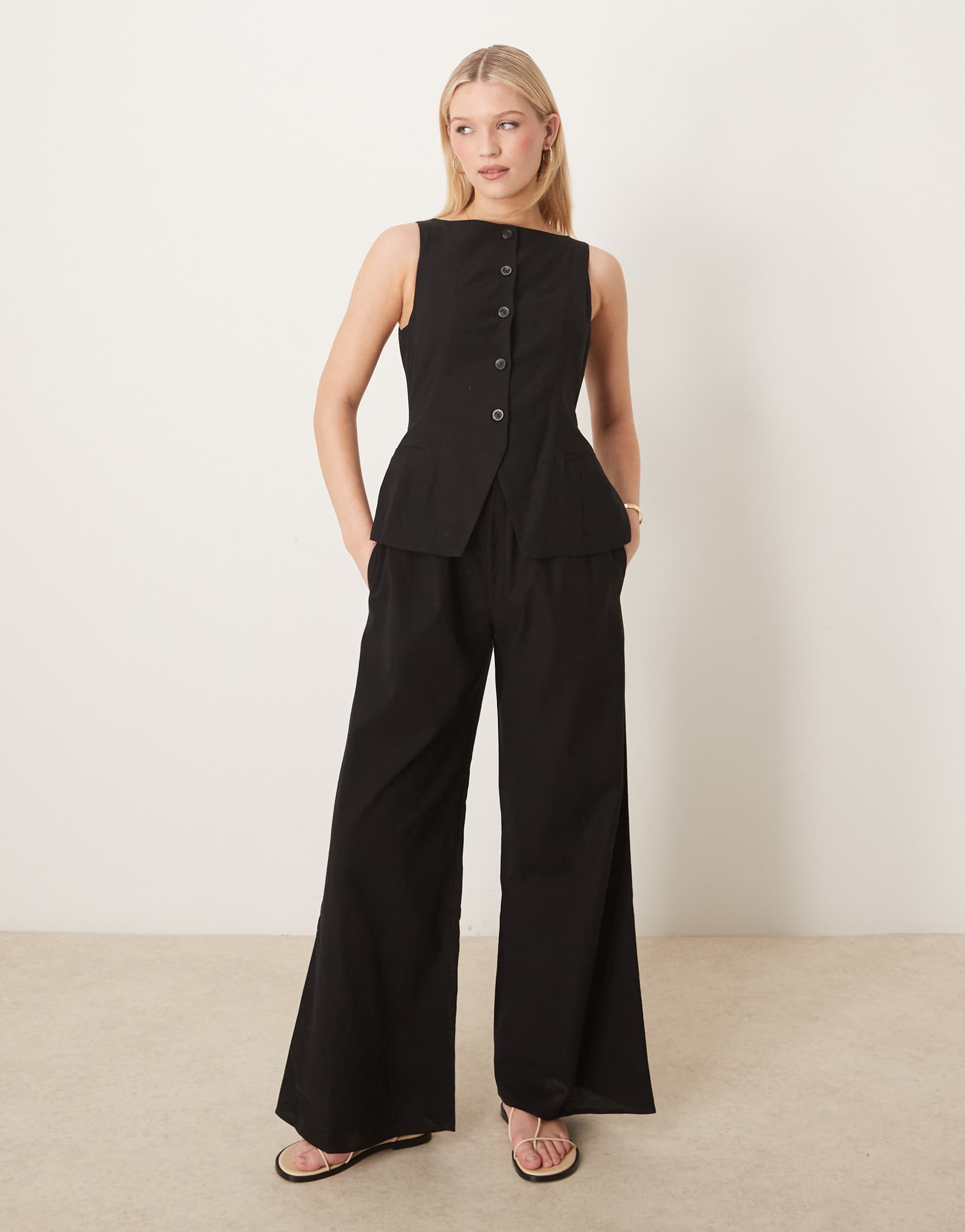 Effortless monochrome chic meets modern utility in this ASOS DESIGN button-down vest jumpsuit. Crafted in a breathable cotton-linen blend, the sleeveless vest top leads into a fluid wide-leg silhouette that flatters every frame. A structured high neckline and button placket lend a refined, tailored edge, while practical side pockets keep things easy and wearable. Perfect for warm days with sandals or dressed up with heels for a polished look. This jumpsuit balances minimalist elegance with contemporary ease, making it a versatile staple for casual outings or city lunches alike.