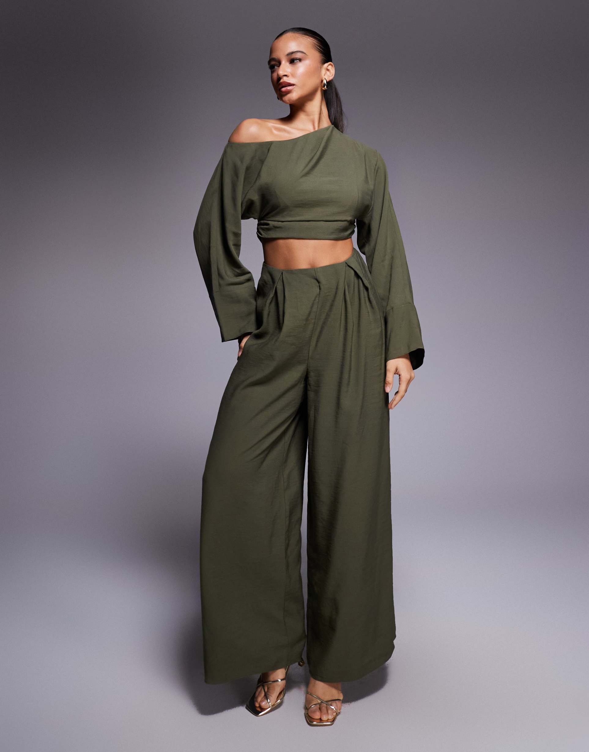 ASOS DESIGN FALLEN SHOULDER FAUX SET JUMPSUIT IN KHAKI