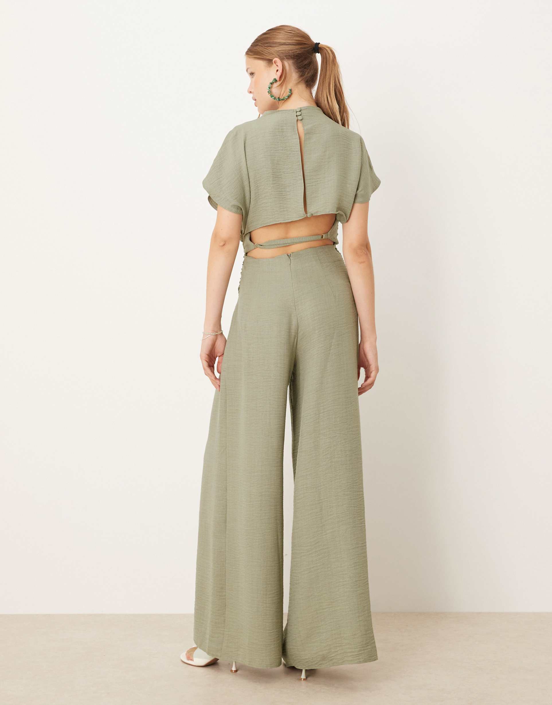 ASOS DESIGN LINEN LOOK OPEN BACK AND RUCHED DETAIL JUMPSUIT IN SAGE GREEN