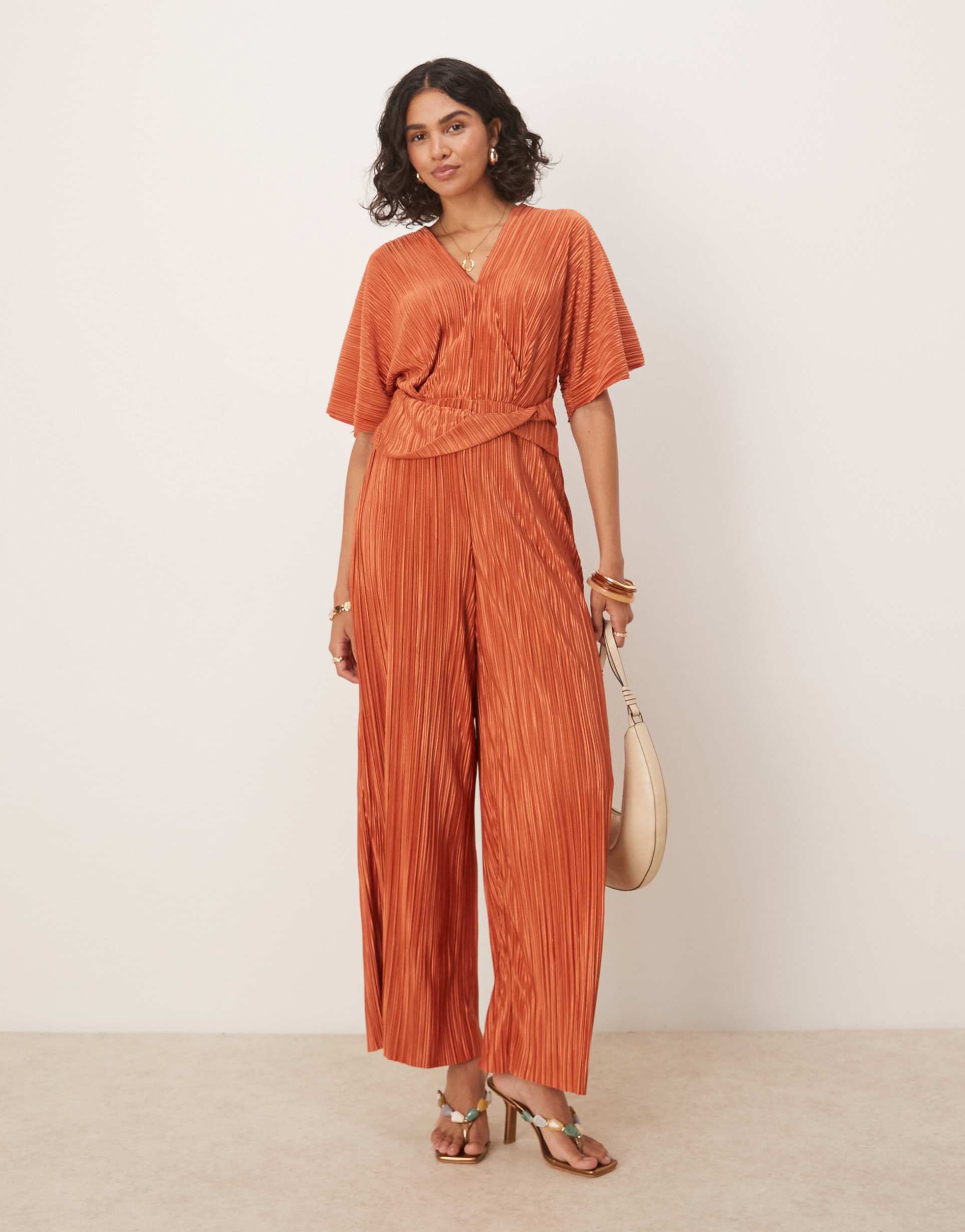 ASOS DESIGN PLISSE PLUNGE SHORT SLEEVE WRAP WAIST JUMPSUIT IN RUST