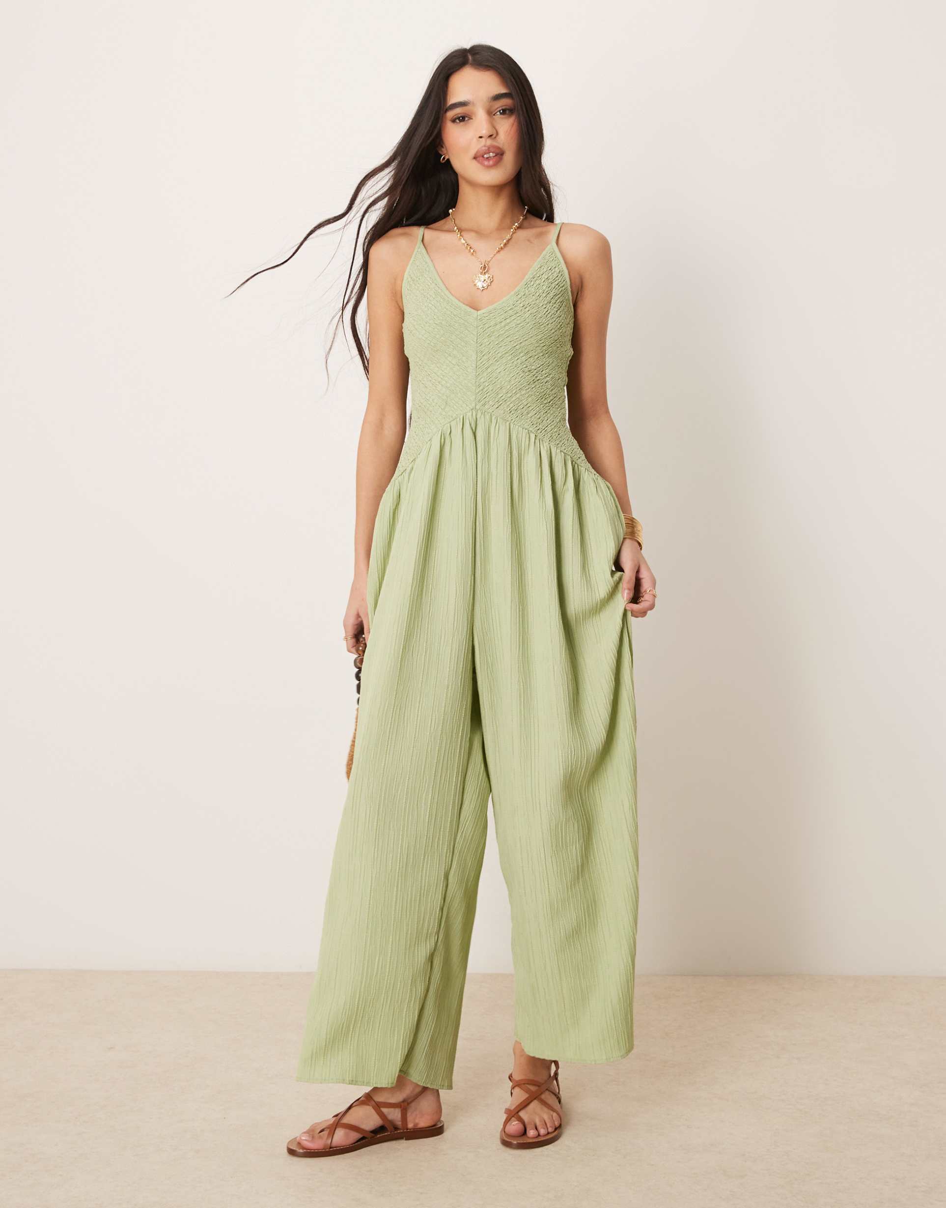 Soft khaki fabric with a subtle crinkle texture shapes this relaxed-fit jumpsuit featuring a flattering V-neckline and sleeveless tie straps. The dropped waist flows into wide, maxi-length legs creating an effortlessly chic silhouette perfect for spring and summer days. An open back adds an airy vibe, while the polyester-elastane blend ensures comfortable stretch and wearability. Ideal for casual outings, brunch dates, or relaxed evenings, this minimalist piece blends comfort with versatile style.