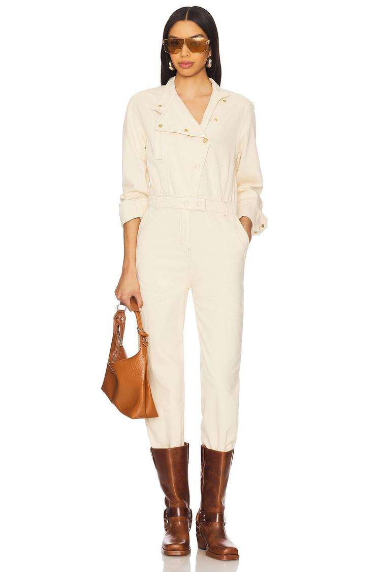 Midweight twill fabric in a soft cream hue defines this classic overall dress with a regular fit and full-length tapered legs. Featuring a notch lapel neckline and long cuffed sleeves, it closes with a zip fly and front buttons that add subtle design interest. Functional four-pocket styling enhances everyday practicality. This versatile piece suits casual days, workwear, and travel, blending comfort from cotton-linen blend fabric with minimalist style that transitions seamlessly through spring, summer, and autumn seasons.