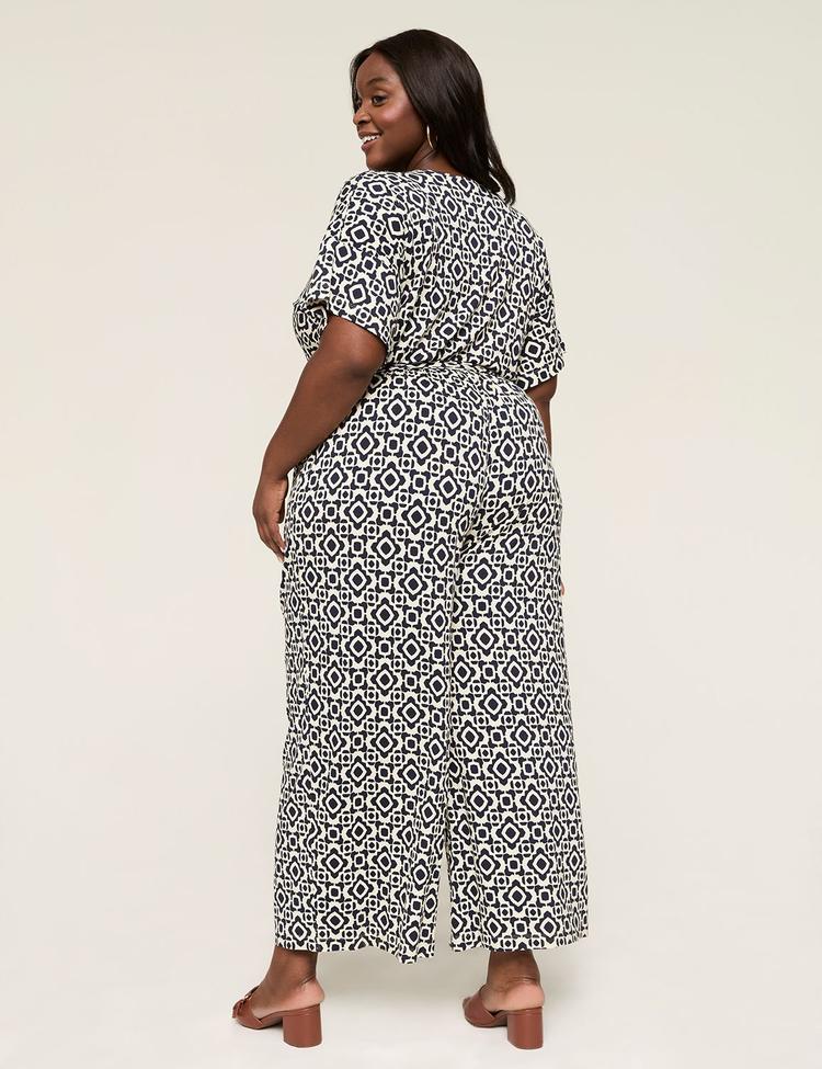 Soft, stretchy crepe knit and a relaxed leg shape make this plus size jumpsuit a comfortable yet stylish choice. Featuring a surplice neckline and flutter kimono half sleeves, it effortlessly balances classic design with ease of wear. The covered elastic waistband with a matching self-tie belt cinches the waist, enhancing the silhouette, while practical pockets add functionality. The all-over black and white geometric pattern adds visual interest, making it ideal for casual days, brunch outings, or date nights. This versatile jumpsuit blends comfort and style for any occasion.