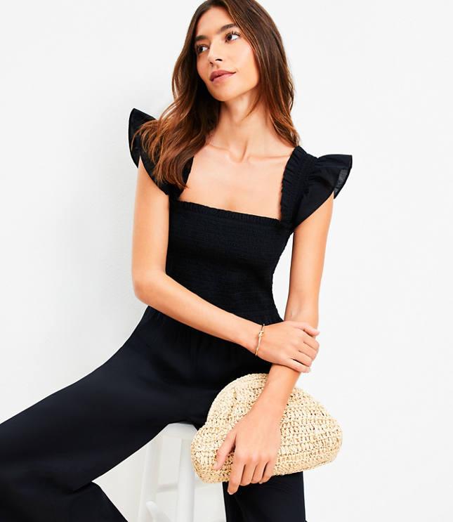 LOFT BEACH SMOCKED RUFFLE STRAP JUMPSUIT