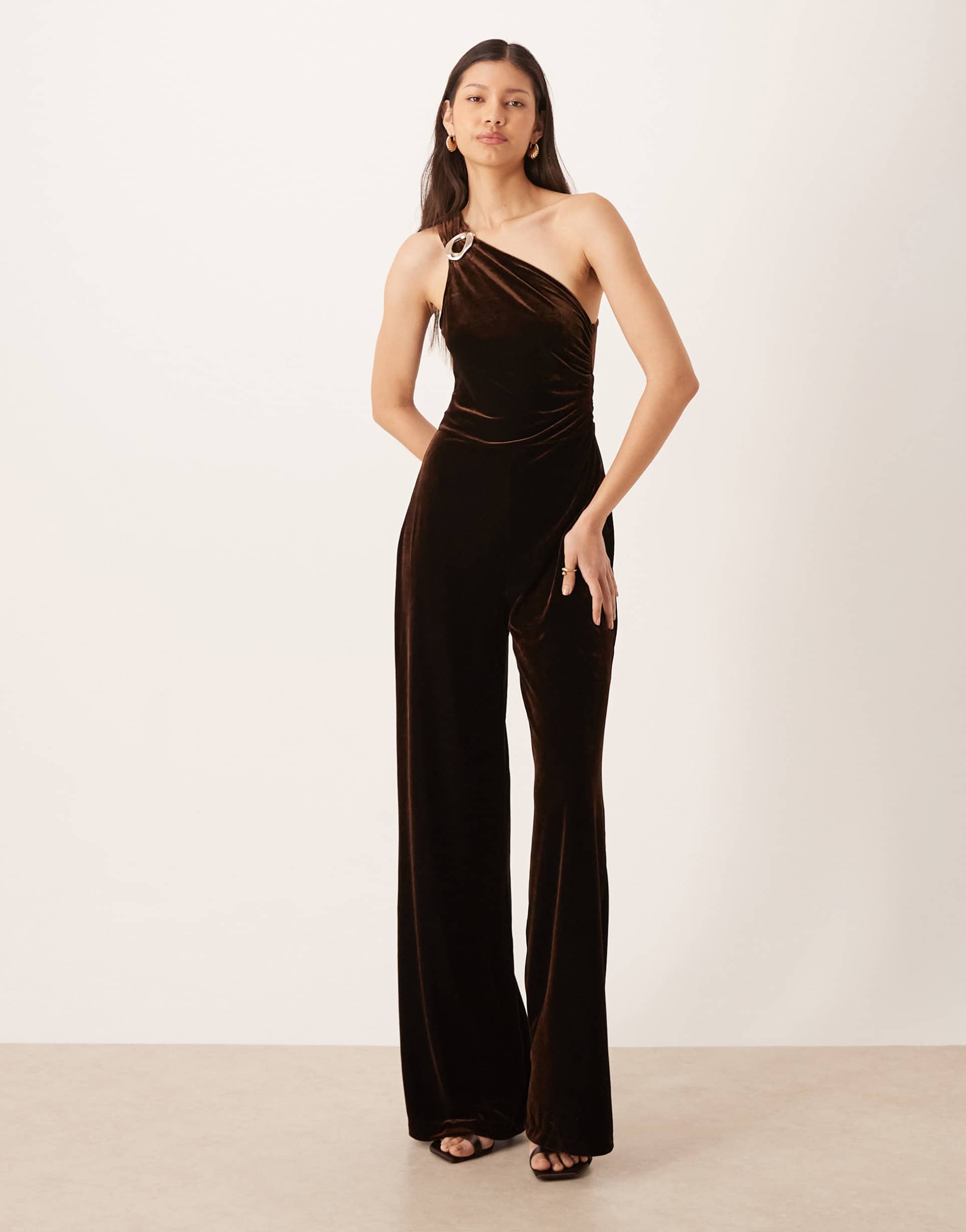 MANGO ONE SHOULDER VELVET JUMPSUIT IN BROWN