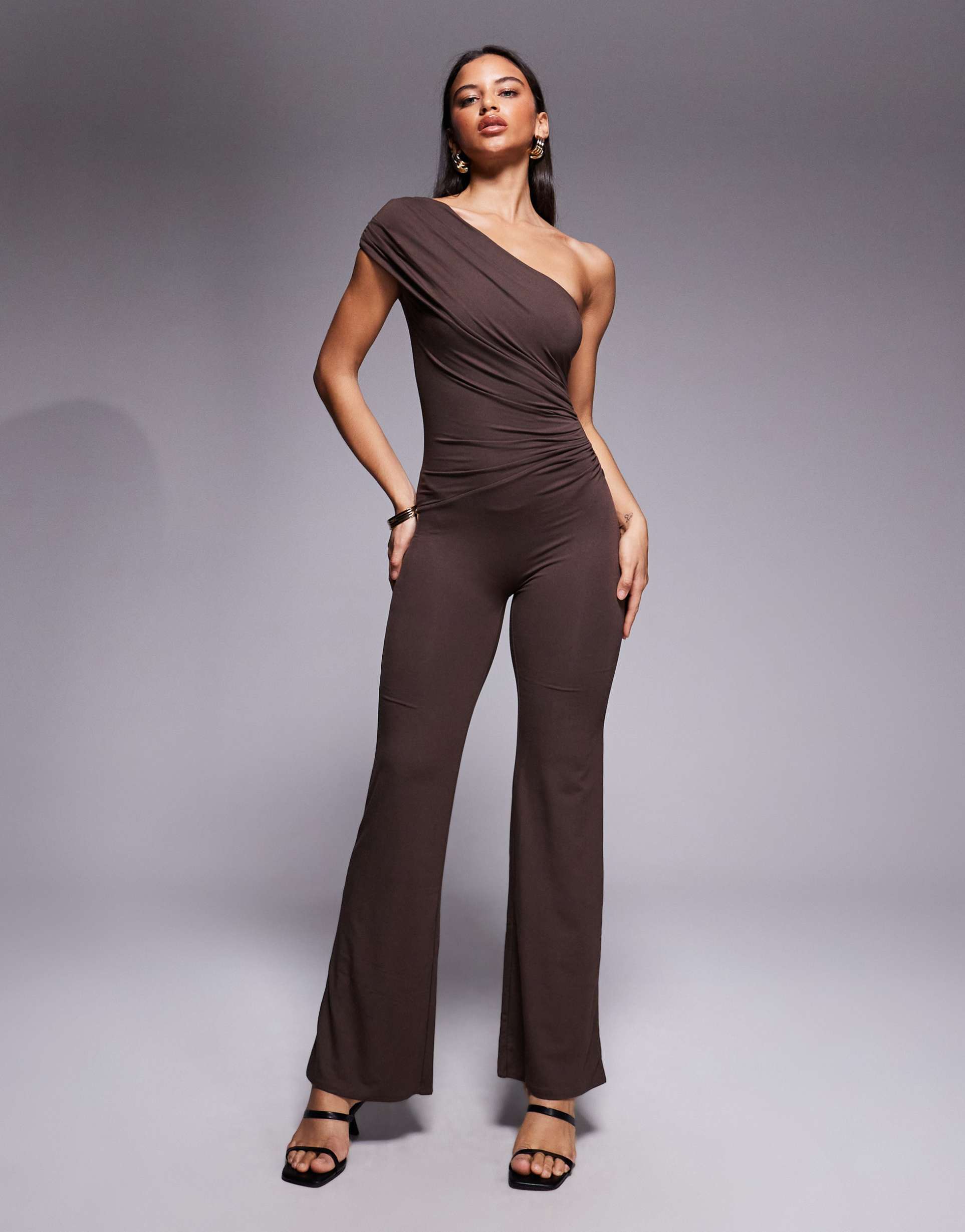 Sleek and sophisticated, this brown jumpsuit features an asymmetric neckline with a chic one-shoulder strap and flattering ruching on the front. The bodycon fit hugs the silhouette while the flared maxi-length legs create a balanced, elegant look. Crafted from a smooth, stretchy modal-elastane blend, it offers comfort and a super-smooth finish perfect for date nights, cocktail parties, or stylish evenings out. The clean hemline and modern design make it a versatile choice for any fashionable occasion.
