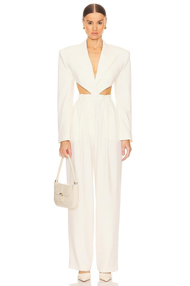 This modern white jumpsuit features a sleek V-neckline and long padded sleeves that add a sharp silhouette. Crafted from a midweight suiting fabric blend of polyester, spandex, and viscose, it offers a comfortable yet structured fit. The design is elevated by bold side and back cut-outs and delicate front pintuck detailing, perfect for cocktail parties, date nights, or stylish evening outings. Its clean maxi hemline and zip fly with hook and bar closure complete this sophisticated look, making it a versatile choice for any chic occasion.