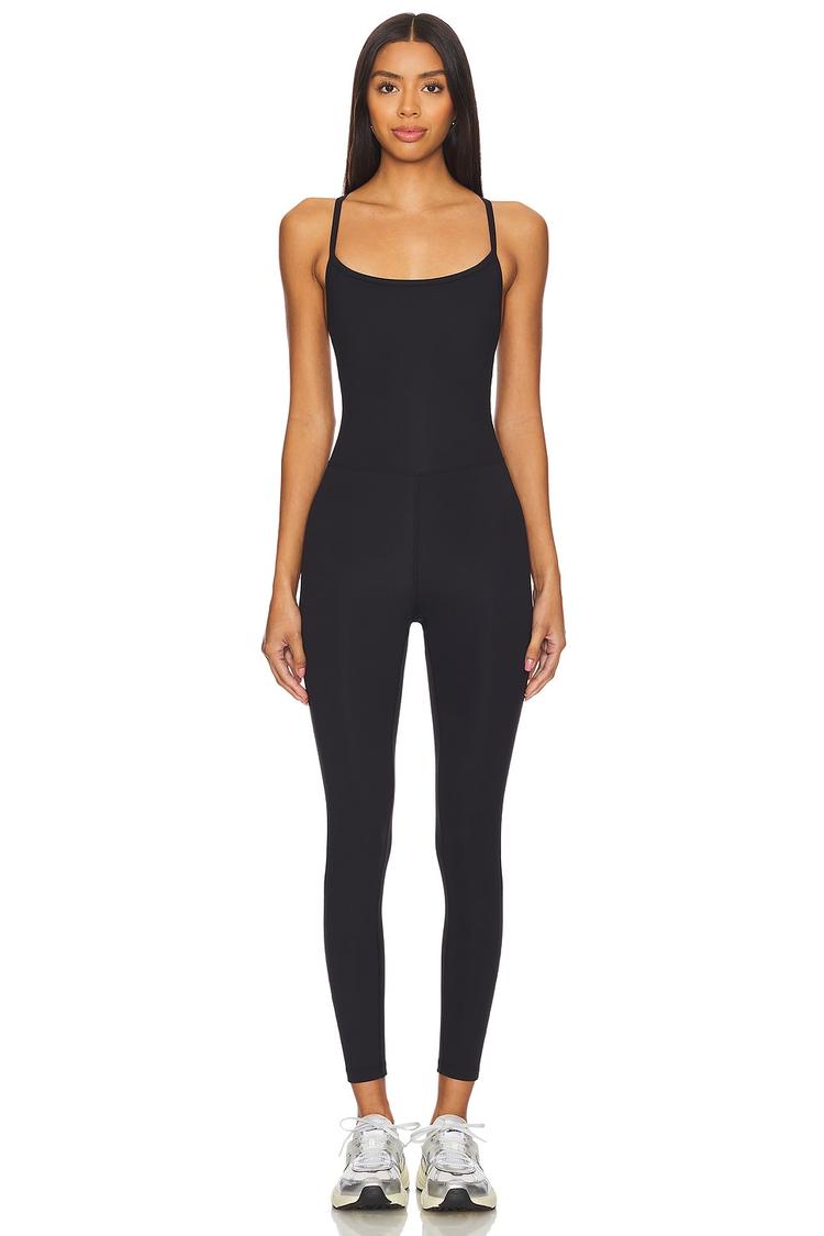 A sleek matte black slim-fit overall dress crafted from elastic nylon jersey offers a sporty yet minimalist vibe. Featuring a square neckline and adjustable spaghetti straps that cross at the back, this pull-on onesie combines comfort and style effortlessly. Perfect for athleisure, casual outings, or workout sessions, its clean hemline and streamlined silhouette ensure versatile wear. Experience ease and function with adjustable straps and breathable fabric, making it ideal for everyday wear or active occasions.