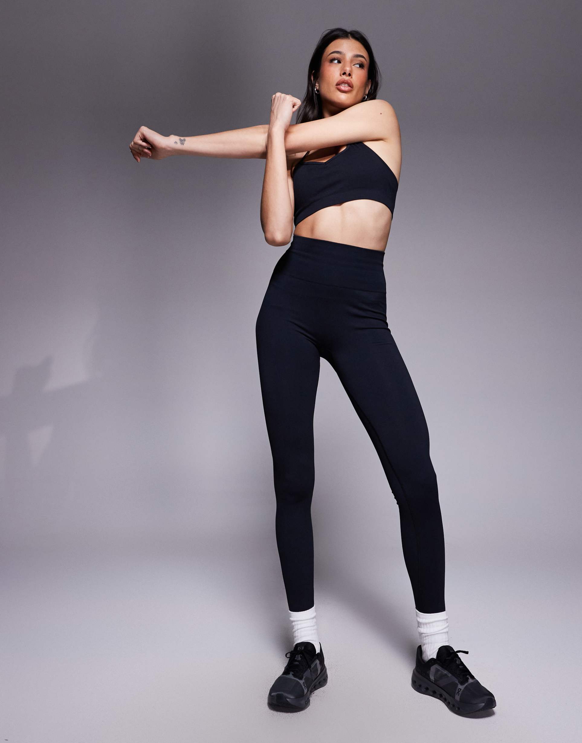 Experience seamless comfort and sleek style with these high-waist gym leggings designed for tall frames. Crafted from a soft, stretchy baby rib knit jersey blend of polyamide and elastane, they offer a bodycon fit that contours and supports your movements effortlessly. Featuring a high-rise, elasticated waistband and clean hemline, these black leggings provide both functionality and a minimalist aesthetic ideal for workouts, athleisure, or casual wear. Embrace all-day wearability with a seamless construction that eliminates chafing and enhances your silhouette, making these leggings a versatile staple for your active and modern lifestyle.