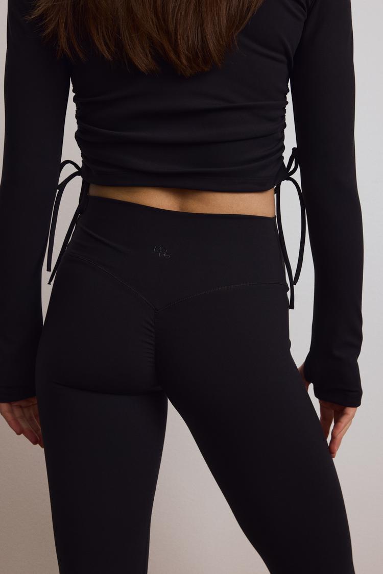 Redefine your activewear with these sleek black scrunch-detail sports leggings from H&M. Crafted from a lightweight, stretchable blend of polyester and elastane, they offer a fitted silhouette that moves with you through every stretch and stride. The high-rise flat-front waistband provides comfortable, secure support, while the distinctive ruched detail at the back adds a subtle yet stylish touch. Perfect for workouts, casual outings, or lounging, these full-length leggings combine functionality with minimalist elegance. Embrace a sporty chic look that balances performance and style effortlessly.