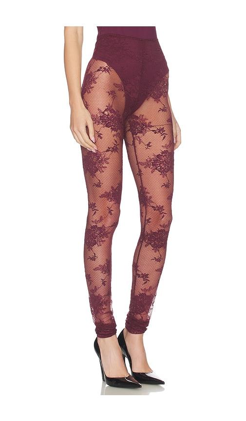 THE ANDAMANE ZILLAH LACE LEGGINGS IN BURGUNDY.