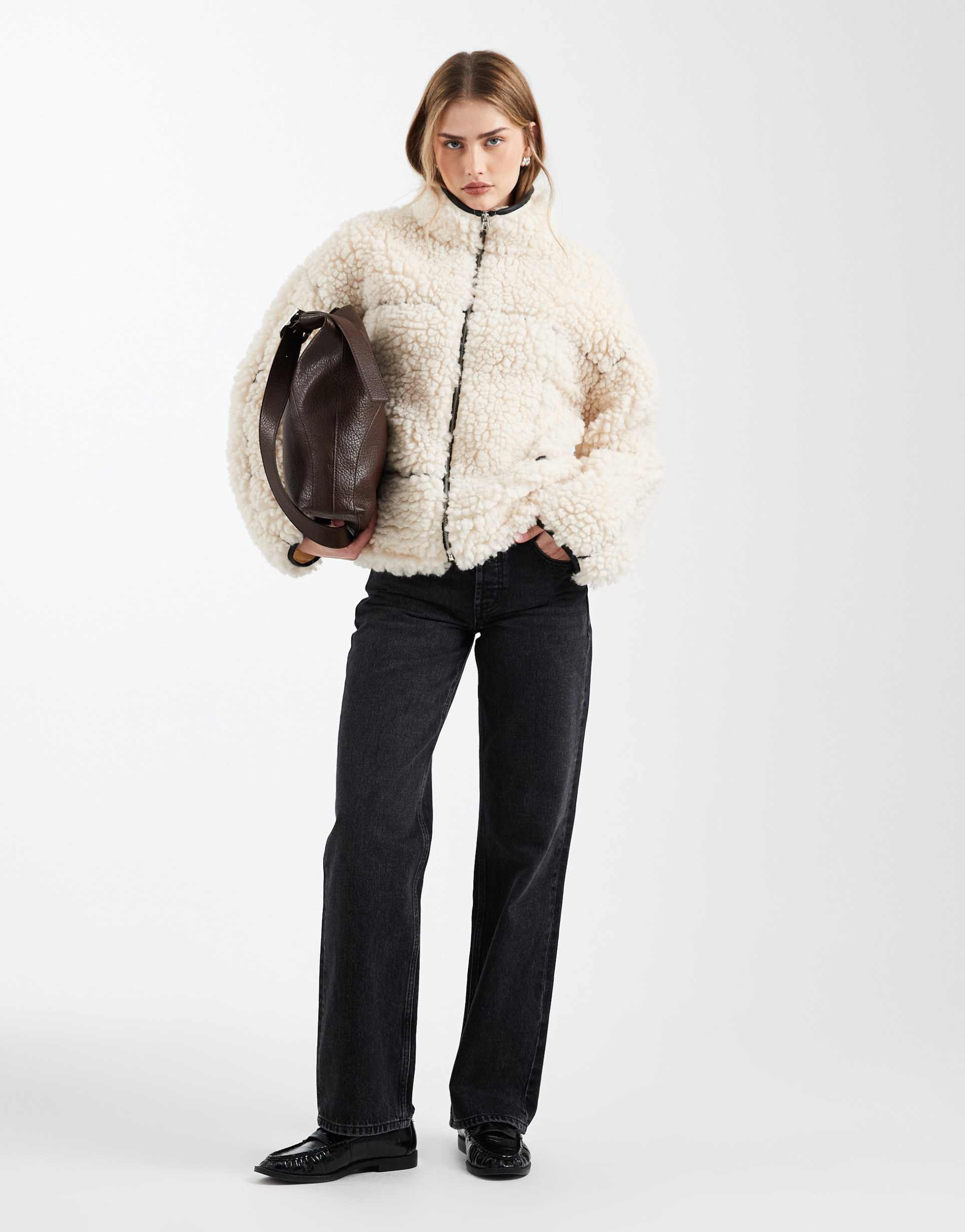 ASOS DESIGN HIGH PILE BORG FLEECE ZIP UP IN CREAM WITH PU TRIM DETAIL