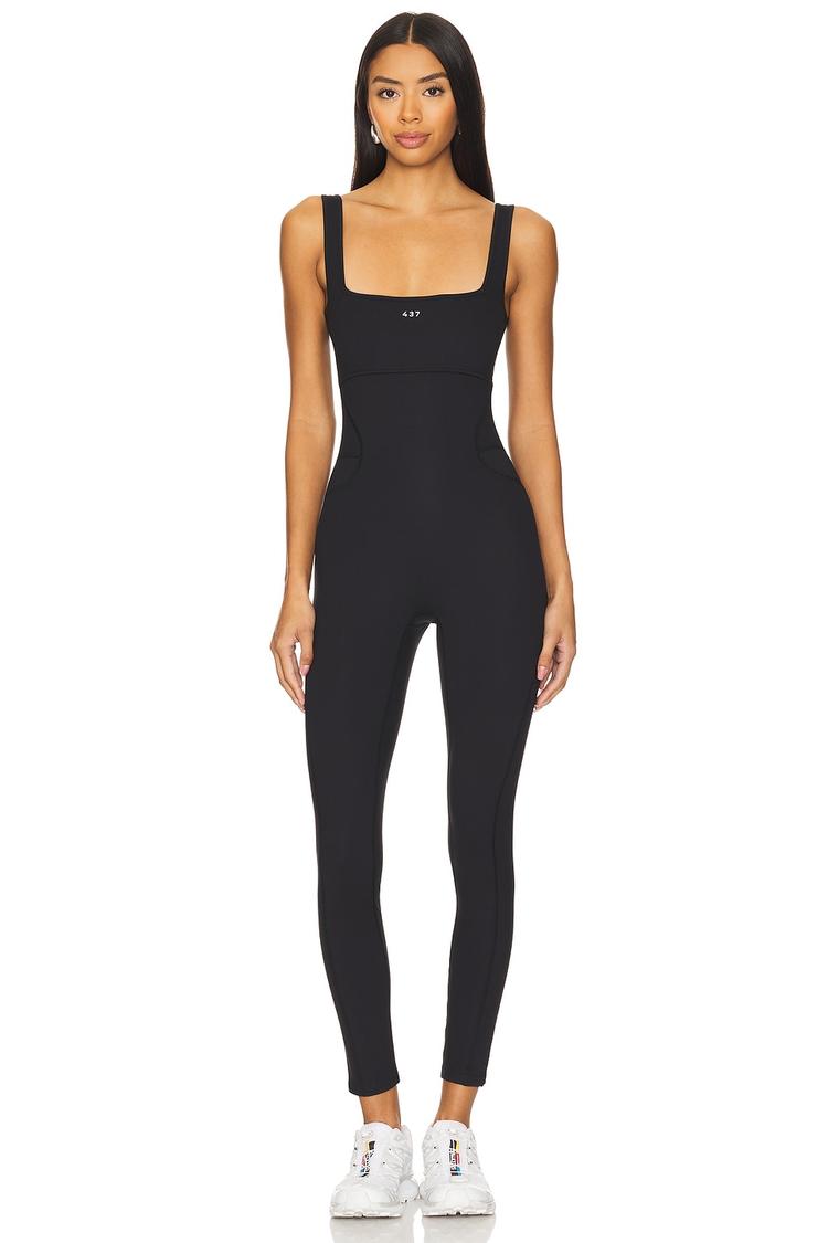 Sleek and versatile, this matte black slim-fit onesie features a square neckline and wide straps for a sporty yet minimalist look. Crafted from a stretchy blend of recycled polyester and elastane, it offers a comfortable pull-on fit that moves with you. The full-length silhouette with a clean hemline makes it ideal for casual days, workouts, or loungewear. Perfect for those seeking an easy-to-wear piece that balances style and function across all seasons.