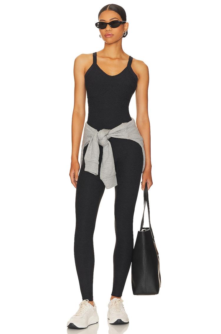 Soft jersey spandex fabric shapes this sleek black jumpsuit featuring a fitted silhouette and full-length legs. Its sleeveless design with wide straps and a flattering U-neckline offers effortless layering potential. Designed with pull-on styling and contour bust details, it provides both comfort and a flattering fit. Perfect for casual days, loungewear, workouts, or travel, this versatile jumpsuit transitions smoothly through all seasons while embracing a sporty chic vibe.