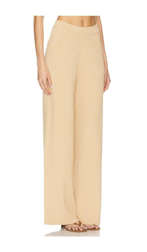 AEXAE FINE KNIT RIBBED STRAIGHT LEG PANT IN TAN.