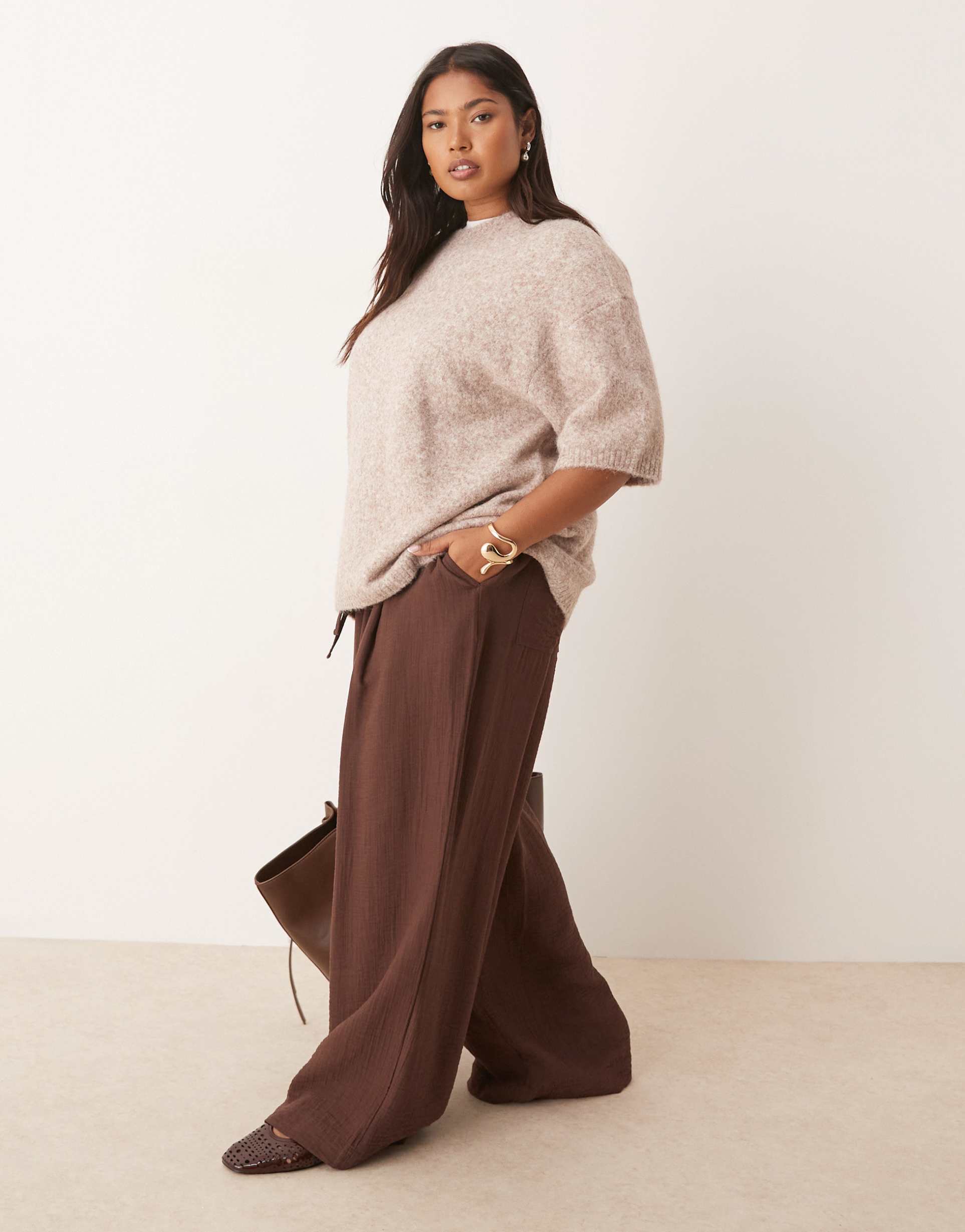 ASOS DESIGN CURVE SOFT TEXTURE WIDE LEG PANTS WITH CONTRAST STITCH IN CHOCOLATE