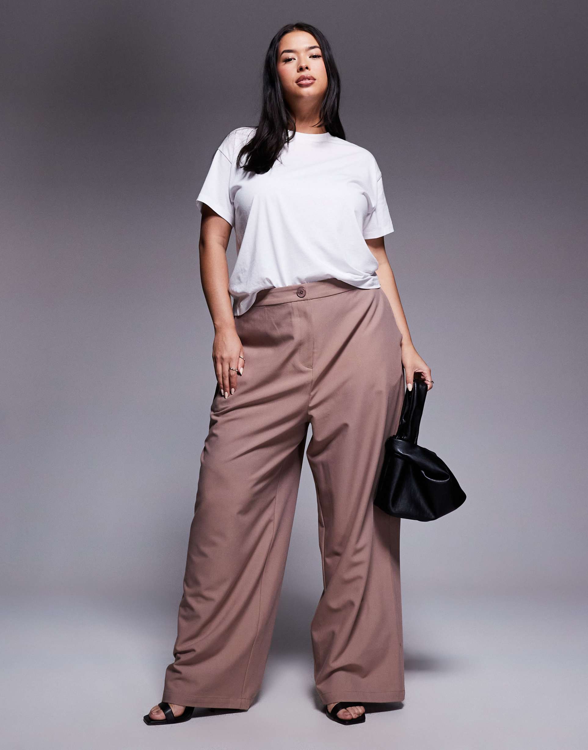 Effortlessly blend comfort and tailored elegance with these ASOS DESIGN Curve relaxed straight leg pants in a versatile matte taupe. Crafted from a smooth poly-viscose-elastane blend, they offer a wrinkle-resistant, stretchable fabric that moves with you. Featuring a mid-rise flat-front waistband and a concealed fly, these pants provide a sleek silhouette with a relaxed fit that flatters plus-size figures. Functional side pockets add practicality while the clean hemline completes the polished look. Perfect for casual days, workwear, or business casual settings, these pants are a sophisticated staple that pairs seamlessly with your favorite tops for everyday chic.