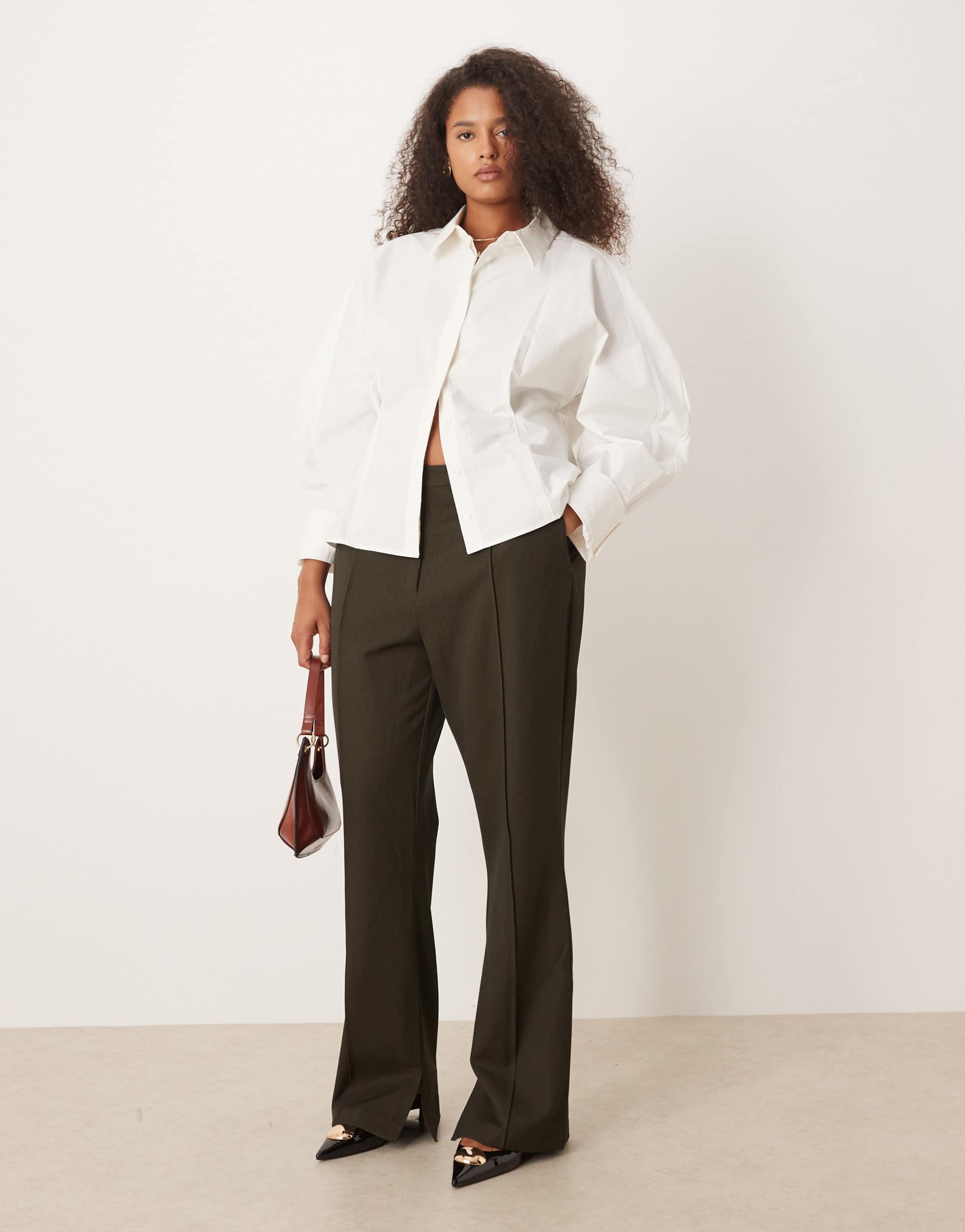 ASOS DESIGN CURVE TAILORED SEAM DETAILING FLARE SUIT PANTS WITH SLIT HEM IN OLIVE
