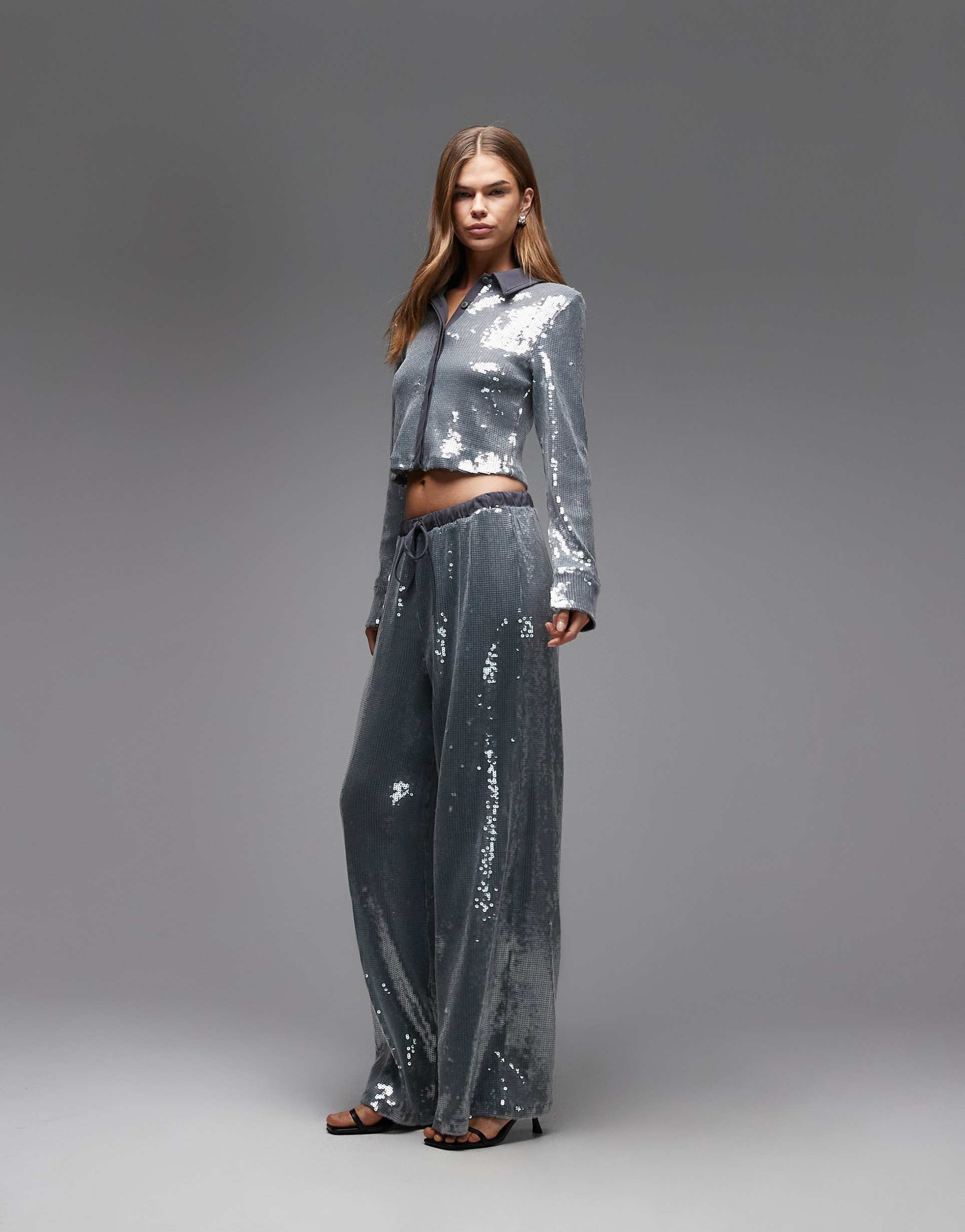ASOS DESIGN GLASS SEQUIN DRAWSTRING WAIST WIDE LEG PANTS IN GRAY - PART OF A SET