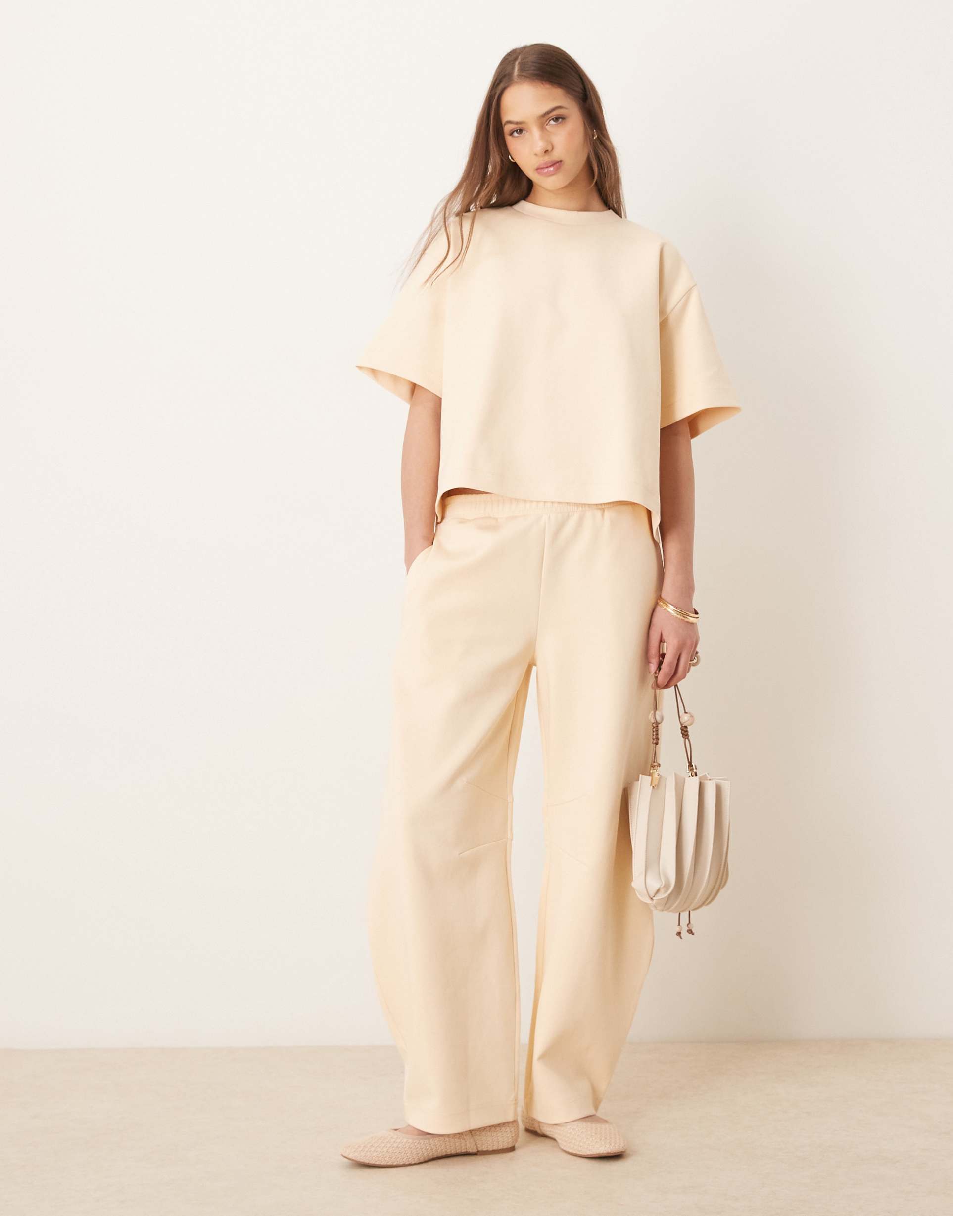 Effortless comfort meets quiet luxury in this buttermilk set of ASOS DESIGN interlock barrel-leg sweatpants with a matching relaxed tee. Crafted in a soft interlock knit blend of cotton with a touch of polyester and elastane, the pants drape in a relaxed wide-leg silhouette from a flexible elastic waistband. Side pockets add everyday practicality, while the clean, minimal hem keeps the line streamlined. Pair with the coordinating top for a chic loungewear look, or dress up with a blazer and sneakers for casual city days. The understated cream tone and breathable knit make it versatile for all-day wear.