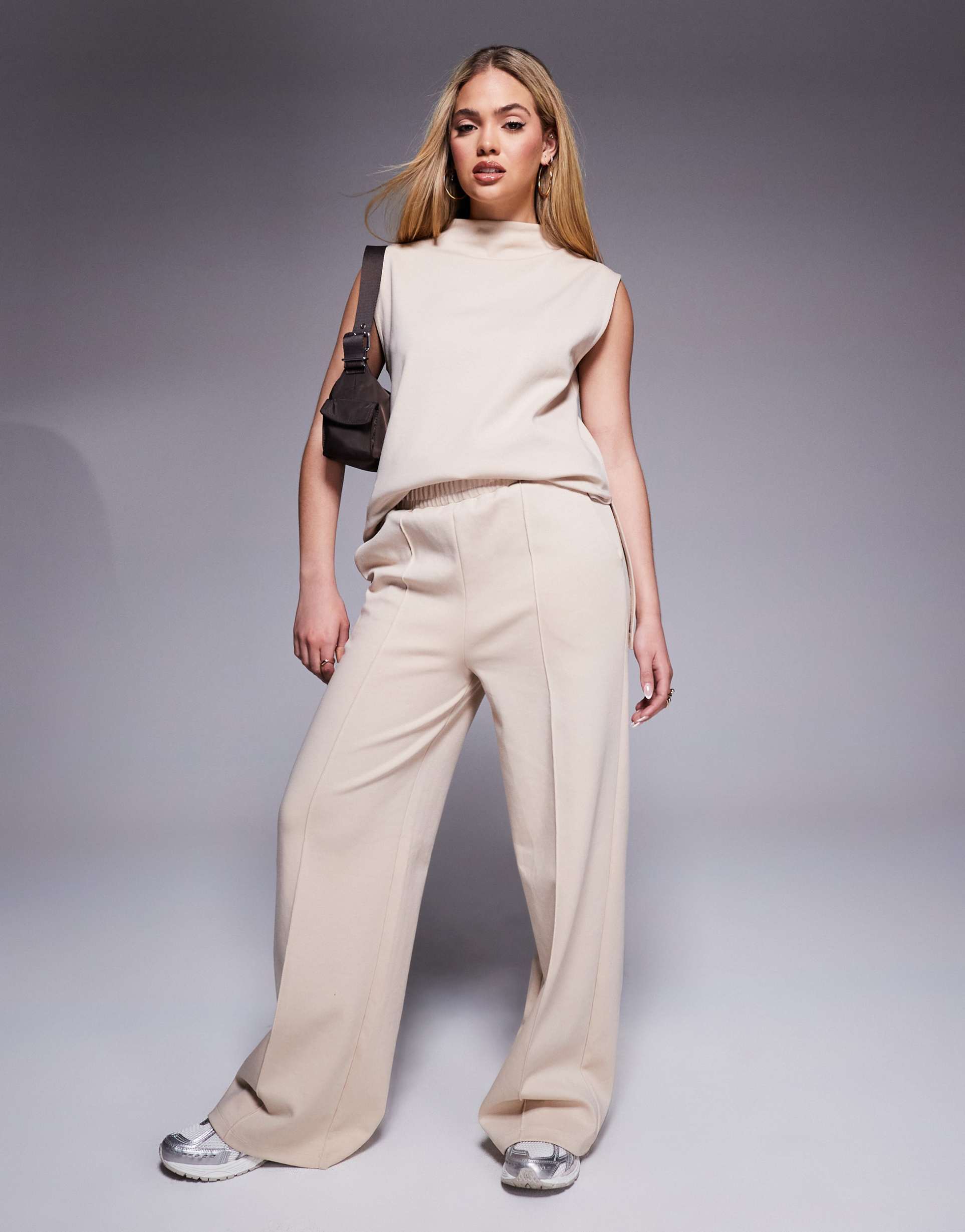 ASOS DESIGN INTERLOCK WIDE LEG PANTS IN NEUTRAL - PART OF A SET