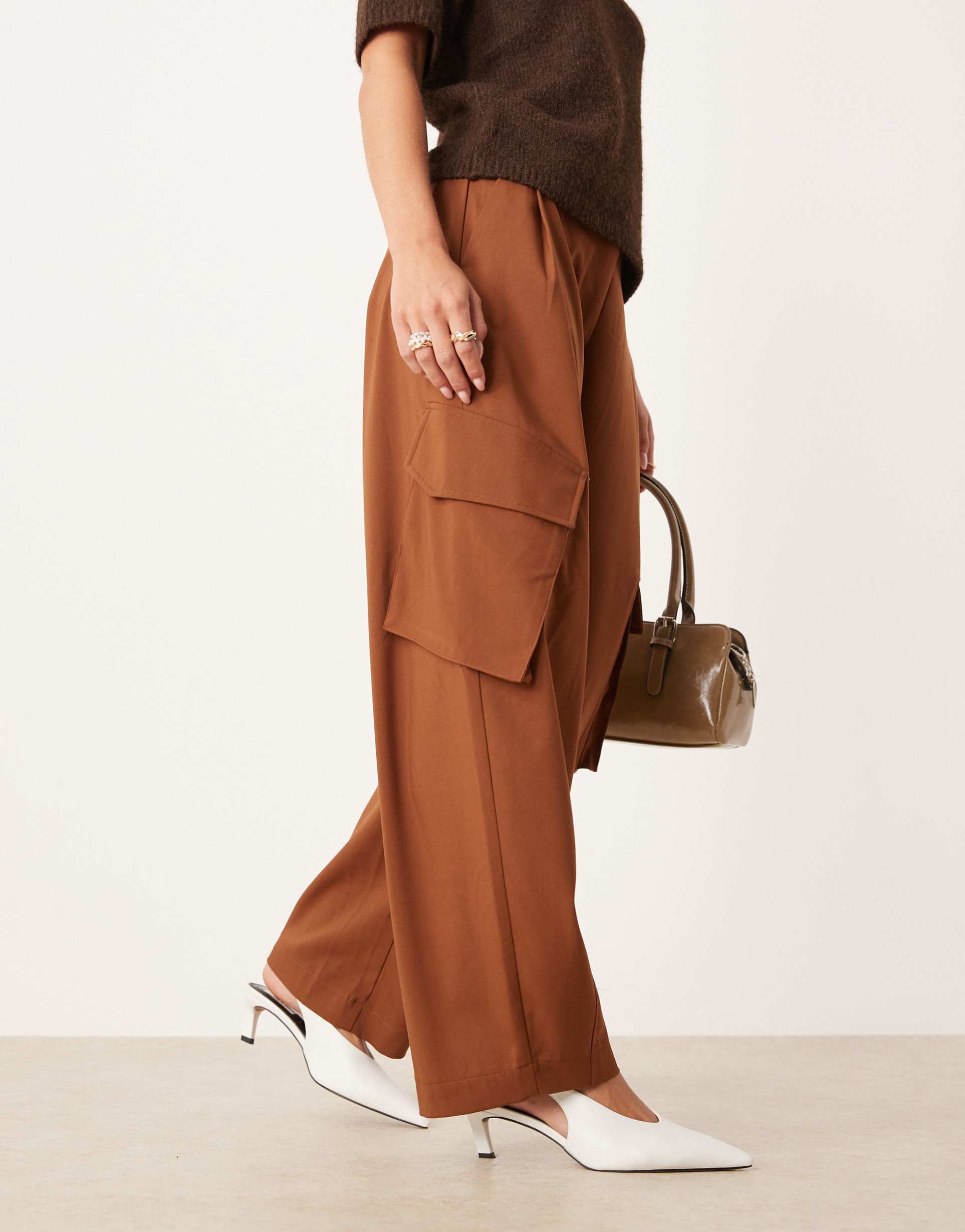 ASOS DESIGN PETITE TAILORED UTILITY BARREL LEG PANTS IN TOBACCO BROWN