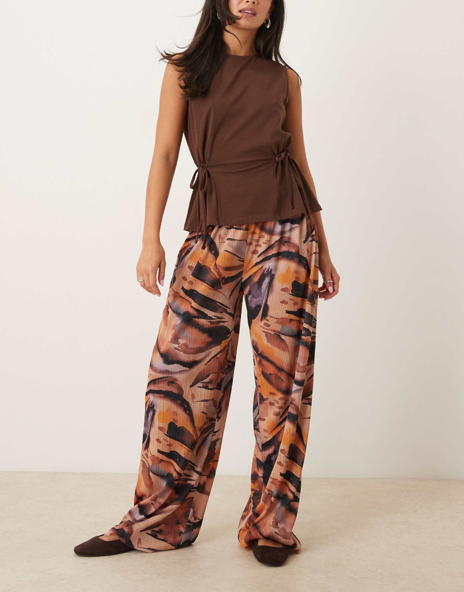 Bring effortless style and comfort to your wardrobe with these ASOS DESIGN plisse wide leg pants, featuring a vibrant orange marbled print. Crafted from lightweight polyester with a delicate pleated texture, these full-length pants offer a relaxed, regular fit and mid-rise silhouette. The elasticated waistband ensures easy wear and a comfortable fit, perfect for casual outings, travel, or everyday wear. Their eye-catching marbled pattern in bright orange, dark brown, black, and beige tones adds a trendy and modern flair. Pair these versatile pants with a simple top to make a bold, fashion-forward statement wherever you go.