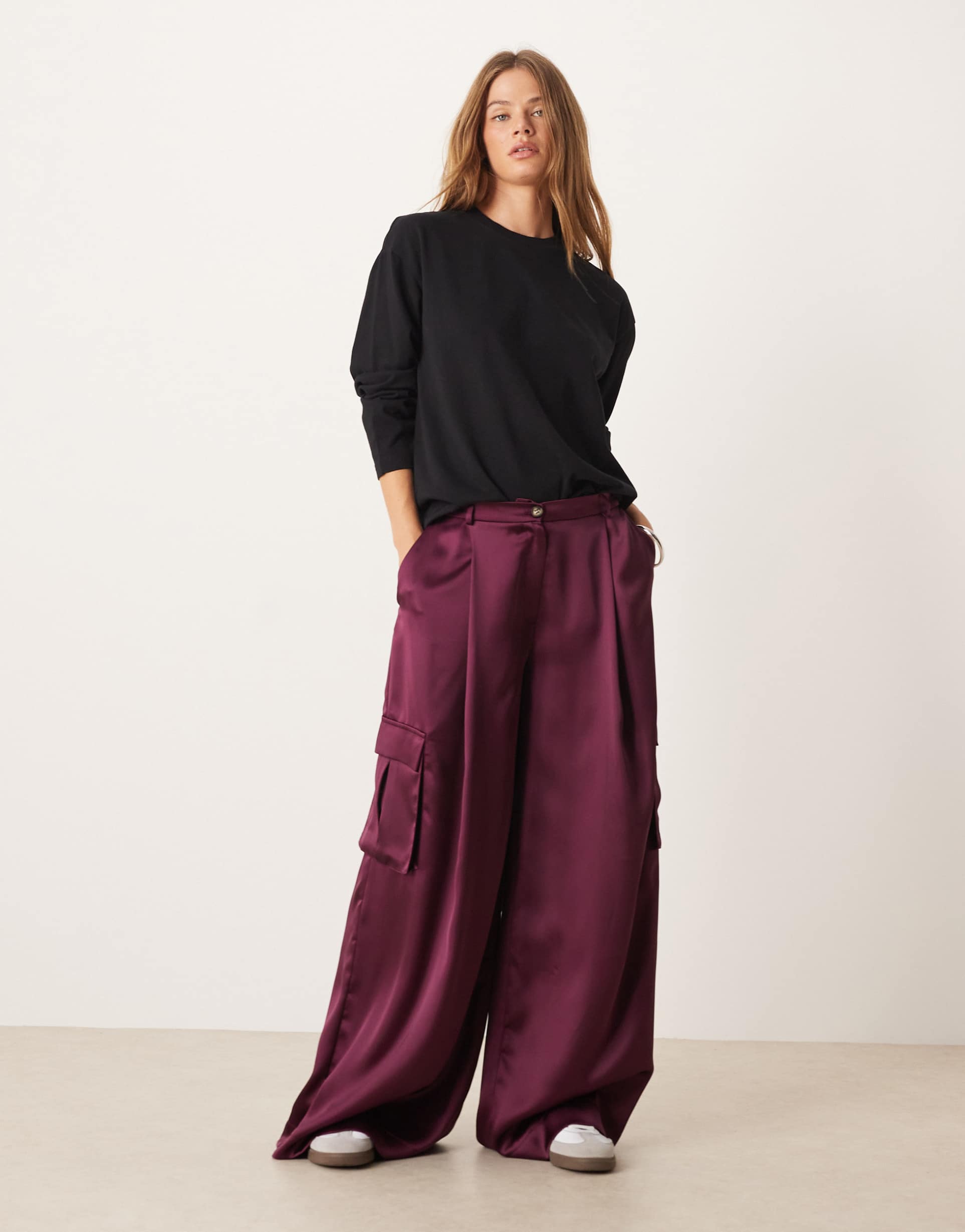 Bring relaxed sophistication to your wardrobe with these ASOS DESIGN satin wide leg cargo pants in a rich plum hue. Crafted from a soft, lightweight blend of viscose and rayon, these pants feature a regular rise with belt loops, functional side and cargo pockets, and a flattering wide-leg silhouette that flows effortlessly to full length. The clean hemline and belted waistband add polished details perfect for casual streetwear or everyday styling. Whether paired with sneakers or dressed up with heels, these versatile cargo pants combine modern ease with trendy functionality for a stylish, comfortable look.