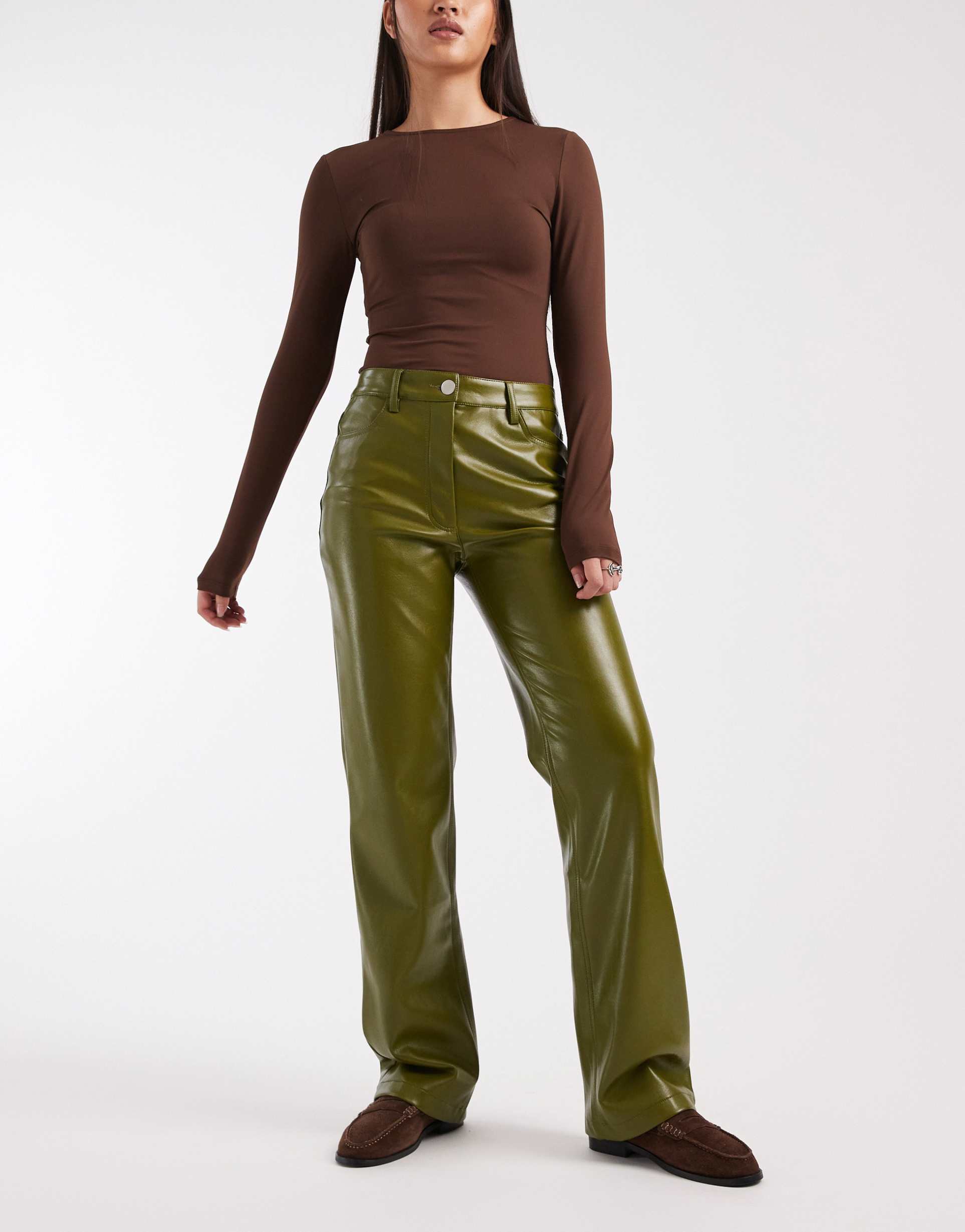 ASOS DESIGN STRAIGHT LEG PANTS IN FAUX LEATHER IN OLIVE