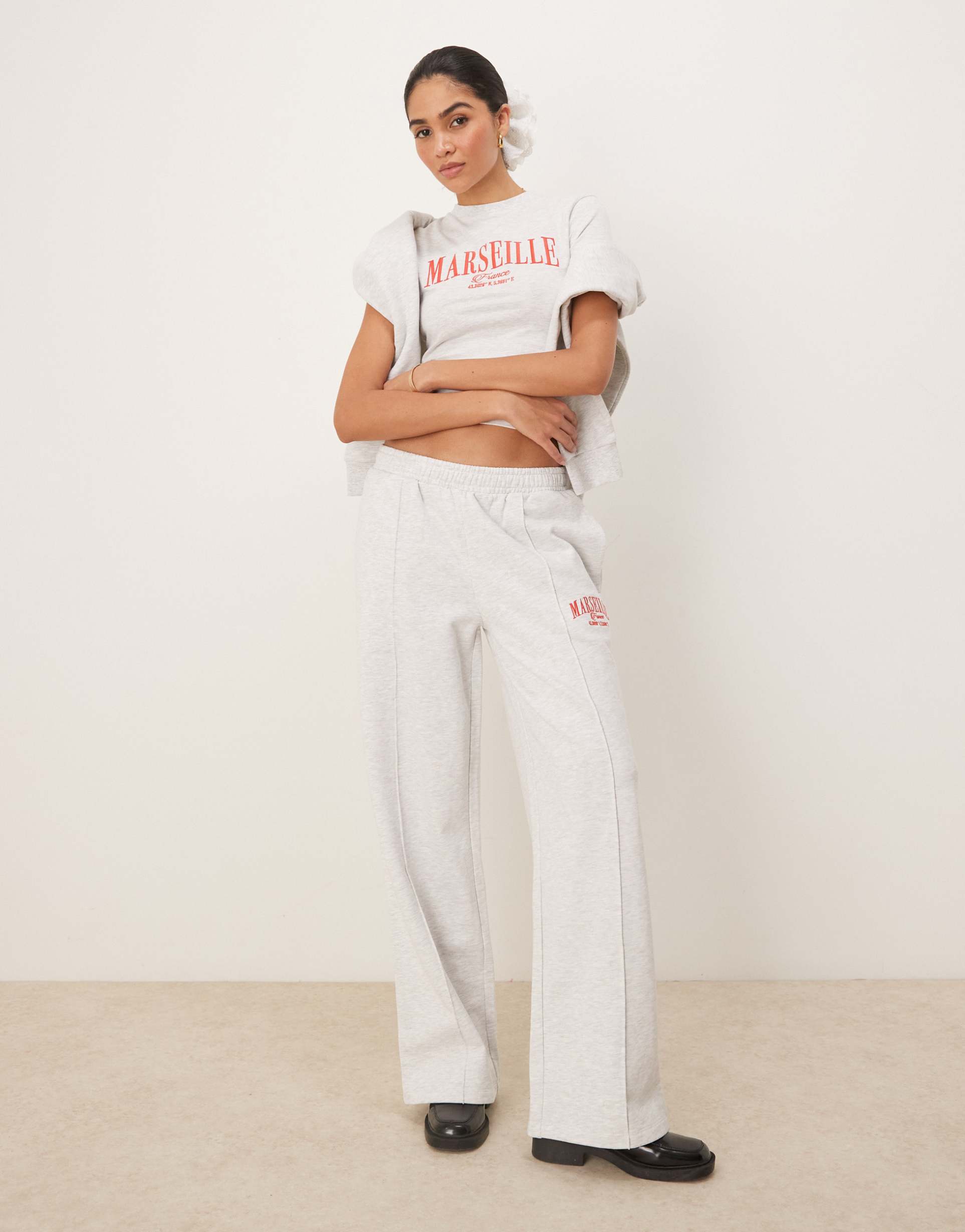 ASOS DESIGN STRAIGHT LEG SWEATPANTS WITH MARSEILLE EMBROIDERED GRAPHIC IN ICE HEATHER