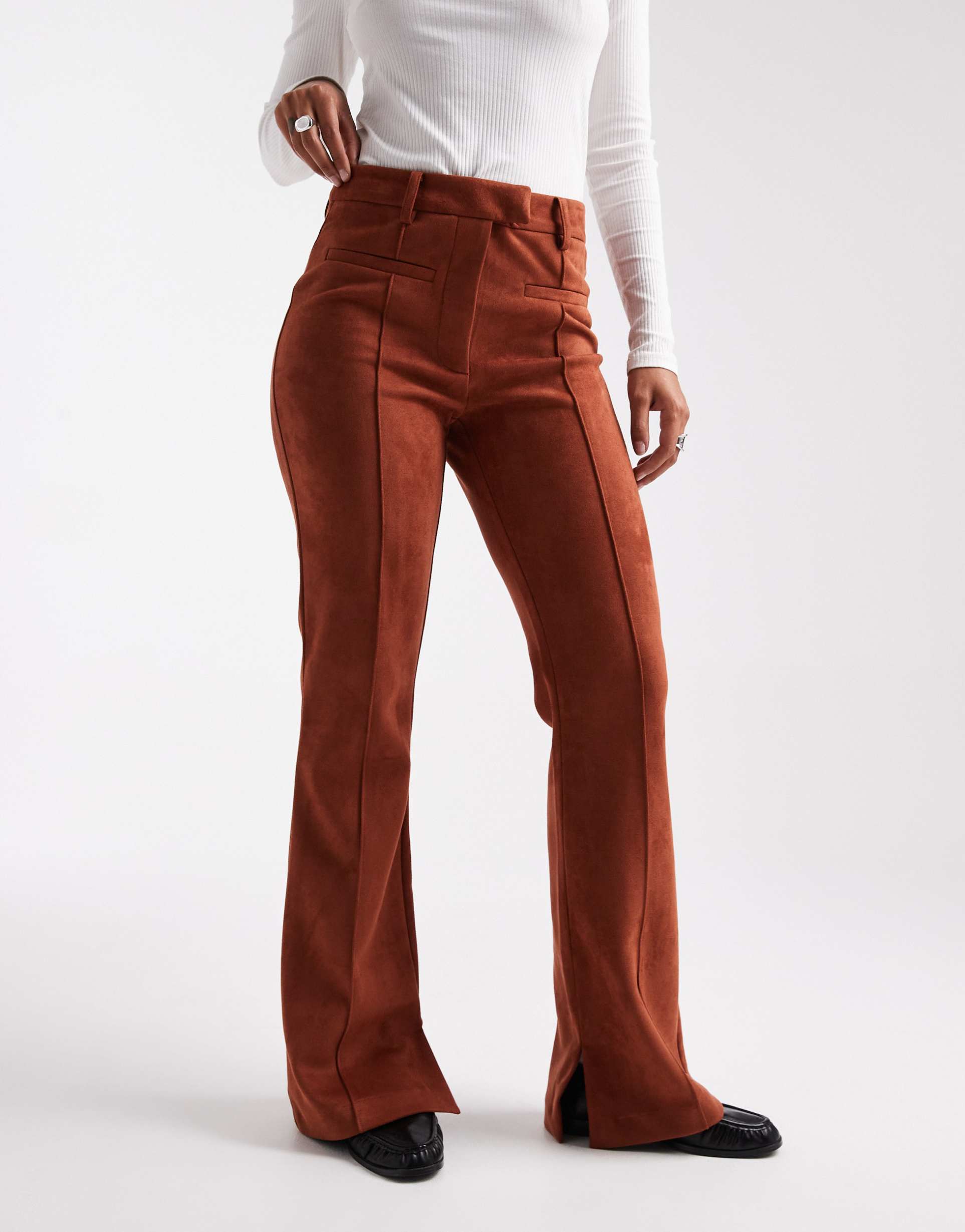 ASOS DESIGN SUEDETTE PATCH POCKET FLARE PANTS IN BROWN
