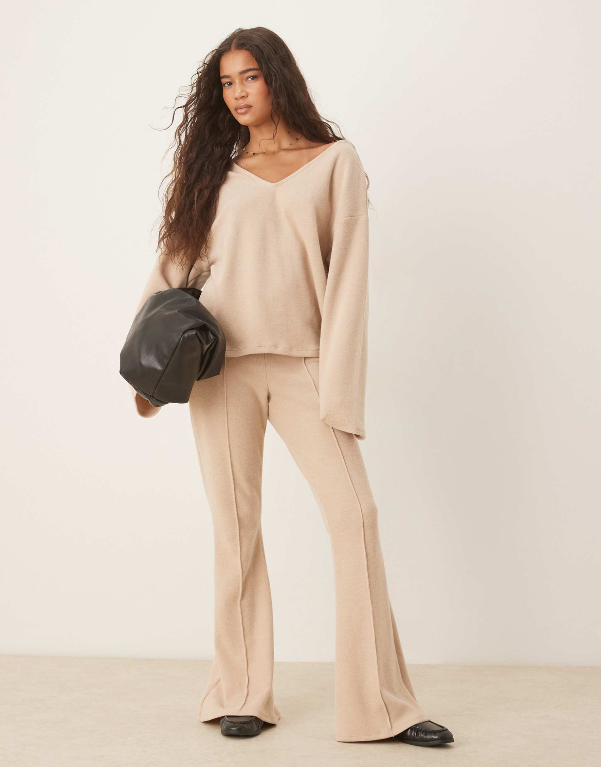Experience laid-back luxury with these ASOS DESIGN Supersoft flare pants in a calming light taupe hue. Crafted from a cozy polyester-cotton knit blend, they feature a high-rise elasticated waistband for all-day comfort and a flattering flared silhouette that elongates the legs. Seam detailing along the front and side panels adds subtle structure to the minimalist design. These full-length pants are perfect for casual outings, relaxing at home, or effortless everyday wear. Their soft-touch fabric and versatile tone make them an essential staple that pairs beautifully with oversized sweaters or sleek tops for a chic yet comfortable look.