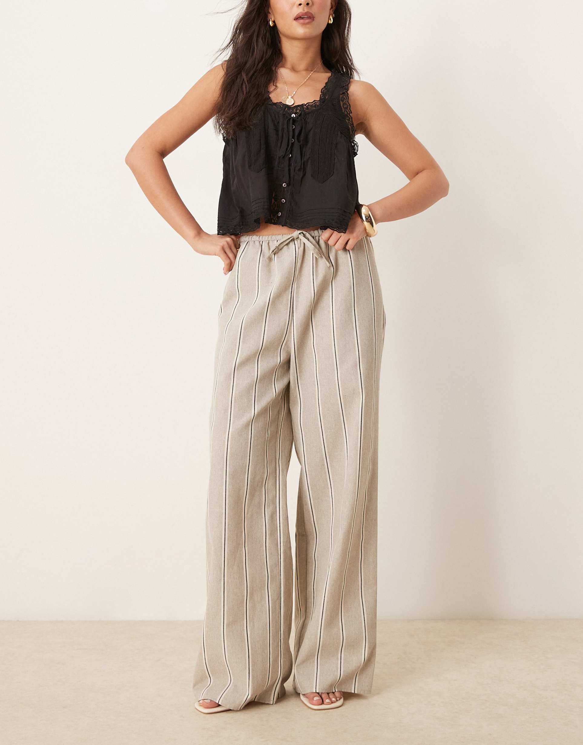 ASOS DESIGN TAILORED LINEN LOOK WIDE LEG PULL ON PANTS IN TAUPE STRIPE