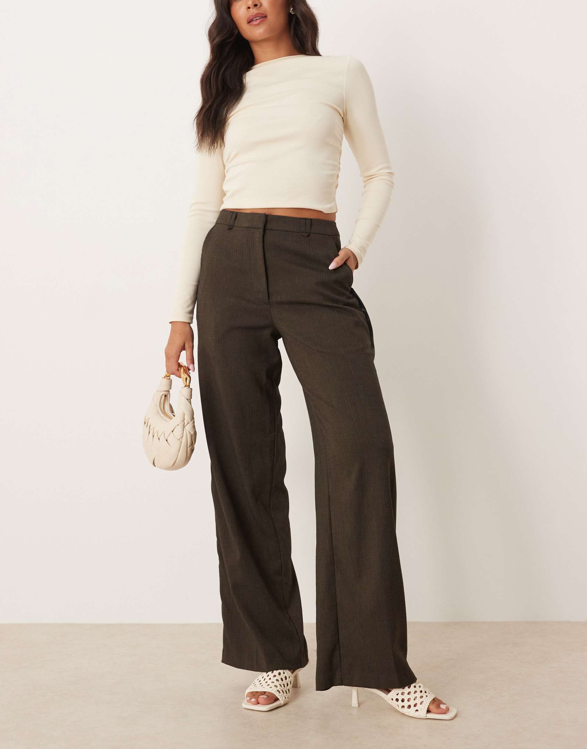 Redefine your professional and casual wardrobe with these ASOS DESIGN tailored relaxed pants, crafted from a smooth polyester-viscose blend with a subtle brown herringbone pattern. The high-rise fit and belted waistband featuring faux leather trim add an elegant touch, while the wide-leg silhouette offers a comfortable yet polished look. Concealed fly and side pockets enhance practicality without compromising style. Ideal for workwear or elevated casual outings, these full-length pants seamlessly blend classic sophistication with modern ease, making them a versatile staple for any season.