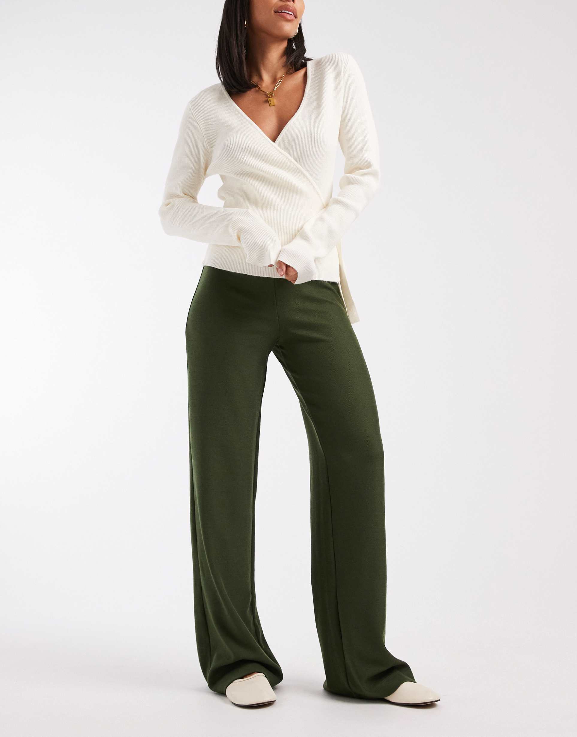 ASOS DESIGN WIDE LEG HEAVYWEIGHT RIB KNIT PANTS IN OLIVE