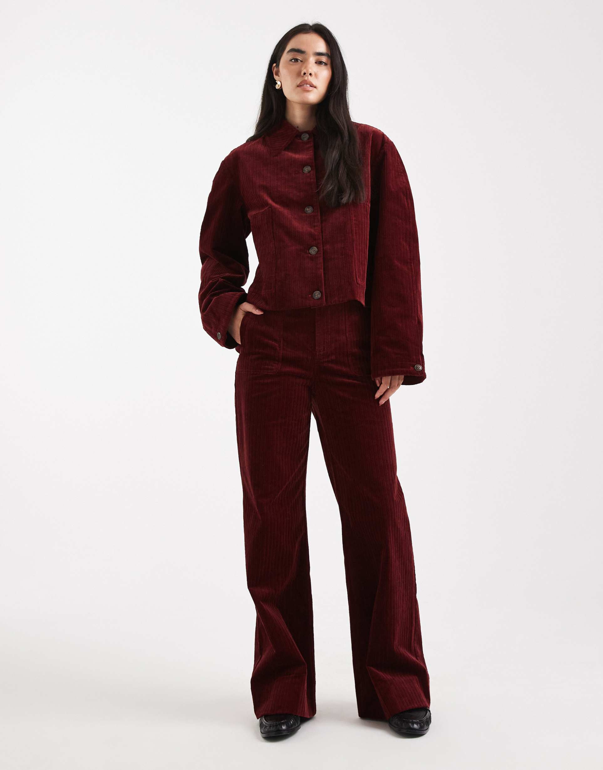 ASOS DESIGN WIDE LEG POCKET DETAIL CORDUROY PANTS IN BURGUNDY