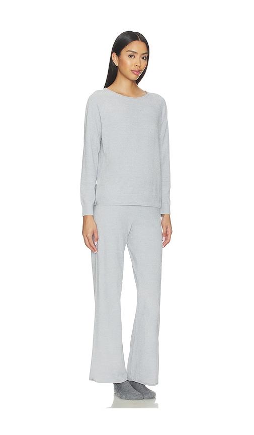 BAREFOOT DREAMS COZYCHIC JERSEY ROLL PULLOVER & WIDE LEG PANT SET IN LIGHT GREY.