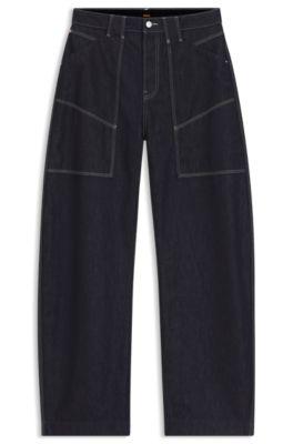 Redefine your denim collection with these dark blue balloon-leg jeans from BOSS, crafted in rigid denim with a clean rinse wash for a modern, polished look. Featuring a relaxed fit and mid-rise waist, these jeans offer both comfort and style. The flat-front waistband and clean hemline emphasize the sleek silhouette, while large front pockets add subtle functionality. Perfect for casual everyday wear, these jeans effortlessly blend contemporary design with classic denim durability, making them a versatile staple for your wardrobe.